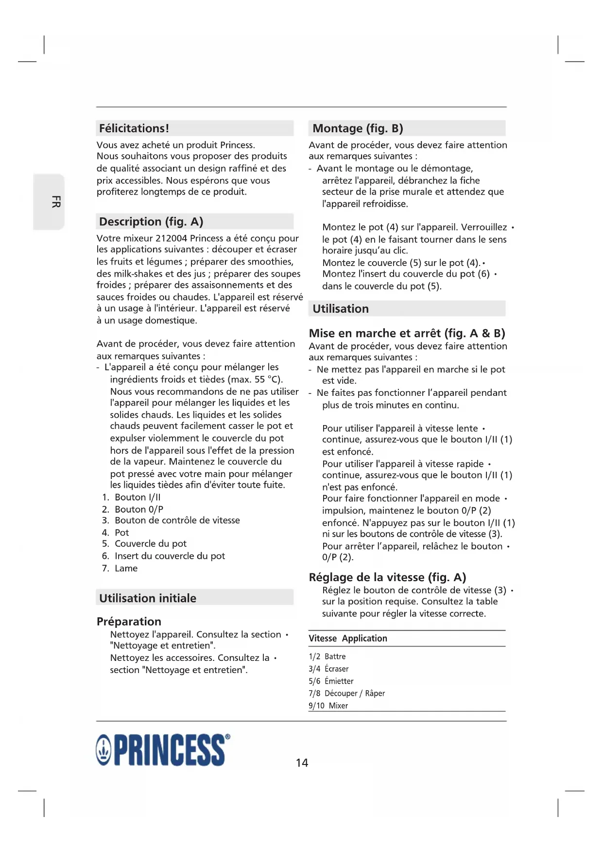 Félicitations! Vous avez acheté un produit Princess. Nous souhaitons vous proposer des produits de qualité associant un design raffiné et des prix accessibles. Nous espérons que vous profiterez longtemps de ce produit. Description (fig. A) Votre mixeur 212004 Princess a été conçu pour les applications suivantes : découper et écraser les fruits et légumes ; préparer des smoothies, des milk-shakes et des jus ; préparer des soupes froides ; préparer des assaisonnements et des sauces froides ou chaudes. L'appareil est réservé à un usage à l'intérieur. L'appareil est réservé à un usage domestique. Avant de procéder, vous devez faire attention aux remarques suivantes : - L'appareil a été conçu pour mélanger les ingrédients froids et tièdes (max. 55 °C). Nous vous recommandons de ne pas utiliser l'appareil pour mélanger les liquides et les solides chauds. Les liquides et les solides chauds peuvent facilement casser le pot et expulser violemment le couvercle du pot hors de l'appareil sous l'effet de la pression de la vapeur. Maintenez le couvercle du pot pressé avec votre main pour mélanger les liquides tièdes afin d'éviter toute fuite.