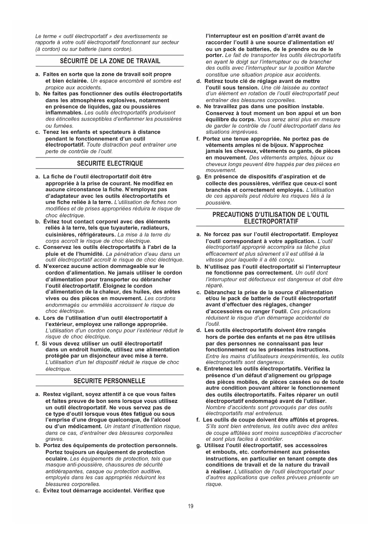 18Le terme « outil électroportatif » des avertissements se rapporte à votre outil électroportatif fonctionnant sur secteur (à cordon) ou sur batterie (sans cordon). SÉCURITÉ DE LA ZONE DE TRAVAIL a. Faites en sorte que la zone de travail soit propre et bien éclairée. Un espace encombré et sombre est propice aux accidents. b. Ne faites pas fonctionner des outils électroportatifs dans les atmosphères explosives, notamment en présence de liquides, gaz ou poussières inammables. Les outils électroportatifs produisent des étincelles susceptibles d’enammer les poussières ou fumées. c. Tenez les enfants et spectateurs à distance pendant le fonctionnement d’un outil électroportatif. Toute distraction peut entraîner une perte de contrôle de l’outil. SECURITE ELECTRIQUE a. La che de l’outil électroportatif doit être appropriée à la prise de courant. Ne modiez en aucune circonstance la che. N’employez pas d’adaptateur avec les outils électroportatifs et une che reliée à la terre. L’utilisation de ches non modiées et de prises appropriées réduira le risque de choc électrique. b. Évitez tout contact corporel avec des éléments reliés à la terre, tels que tuyauterie, radiateurs, cuisinières, réfrigérateurs. La mise à la terre du corps accroît le risque de choc électrique. c. Conservez les outils électroportatifs à l’abri de la pluie et de l’humidité. La pénétration d’eau dans un outil électroportatif accroît le risque de choc électrique. d. N’exercez aucune action dommageable sur le cordon d’alimentation. Ne jamais utiliser le cordon d’alimentation pour transporter ou débrancher l’outil électroportatif. Éloignez le cordon d’alimentation de la chaleur, des huiles, des arêtes vives ou des pièces en mouvement. Les cordons endommagés ou emmêlés accroissent le risque de choc électrique. e. Lors de l’utilisation d’un outil électroportatif à l’extérieur, employez une rallonge appropriée. L’utilisation d’un cordon conçu pour l’extérieur réduit le risque de choc électrique. f. Si vous devez utiliser un outil électroportatif dans un endroit humide, utilisez une alimentation protégée par un disjoncteur avec mise à terre. L’utilisation d’un tel dispositif réduit le risque de choc électrique. SECURITE PERSONNELLE a. Restez vigilant, soyez attentif à ce que vous faites et faites preuve de bon sens lorsque vous utilisez un outil électroportatif. Ne vous servez pas de ce type d’outil lorsque vous êtes fatigué ou sous l’emprise d’une drogue quelconque, de l’alcool ou d’un médicament. Un instant d’inattention risque, dans ce cas, d’entraîner des blessures corporelles graves. b. Portez des équipements de protection personnels. Portez toujours un équipement de protection oculaire. Les équipements de protection, tels que masque anti-poussière, chaussures de sécurité antidérapantes, casque ou protection auditive, employés dans les cas appropriés réduiront les blessures corporelles. c. Évitez tout démarrage accidentel. Vériez que l’interrupteur est en position d’arrêt avant de raccorder l’outil à une source d’alimentation et/ ou un pack de batteries, de le prendre ou de le porter. Le fait de transporter les outils électroportatifs en ayant le doigt sur l’interrupteur ou de brancher des outils avec l’interrupteur sur la position Marche constitue une situation propice aux accidents. d. Retirez toute clé de réglage avant de mettre l’outil sous tension. Une clé laissée au contact d’un élément en rotation de l’outil électroportatif peut entraîner des blessures corporelles. e. Ne travaillez pas dans une position instable. Conservez à tout moment un bon appui et un bon équilibre du corps. Vous serez ainsi plus en mesure de garder le contrôle de l’outil électroportatif dans les situations imprévues. f. Portez une tenue appropriée. Ne portez pas de vêtements amples ni de bijoux. N’approchez jamais les cheveux, vêtements ou gants, de pièces en mouvement. Des vêtements amples, bijoux ou cheveux longs peuvent être happés par des pièces en mouvement. g. En présence de dispositifs d’aspiration et de collecte des poussières, vériez que ceux-ci sont branchés et correctement employés. L’utilisation de ces appareils peut réduire les risques liés à la poussière.