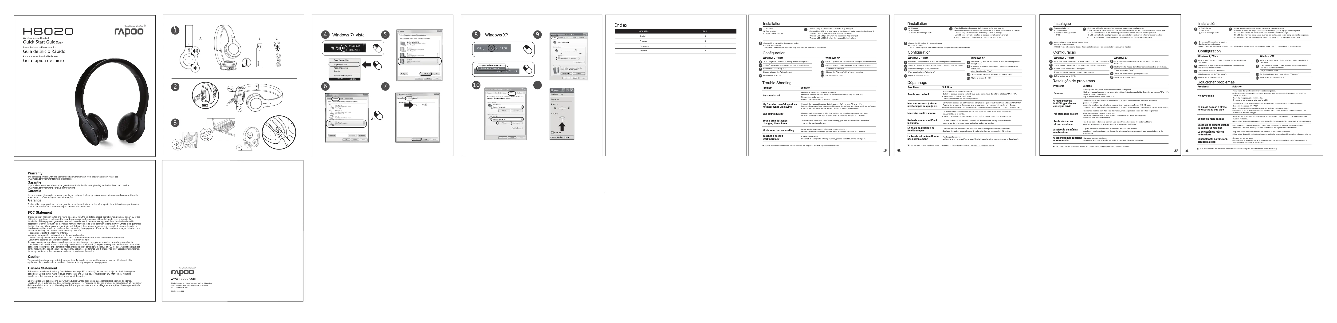 -Augmenter le volume du microphone et augmenter le volume du logiciel msn / Skype. -Vérifier que le casque est défini comme périphérique par défaut sur le logiciel msn / Skype. Mon ami sur msn / skype n'entend pas ce que je dis Mauvaise qualité sonore -La portée Bluetooth maximale est de 10m, mais les murs épais et les gros objets peuvent réduire la portée. -Déplacer les autres appareils sans fil en fonction loin du casque et de l'émetteur. Perte de son en modifiant le volume -Ce comportement est normal. Mais si il est déconcertant, vous pouvez utiliser la commande de volume de votre logiciel de lecture de médias. l'installation Si votre problème n'est pas résolu, merci de contacter le helpdesk sur www.rapoo.com/H8020/faq. Aller dans "Ajuster les propriétés audio" pour configurer le microphone