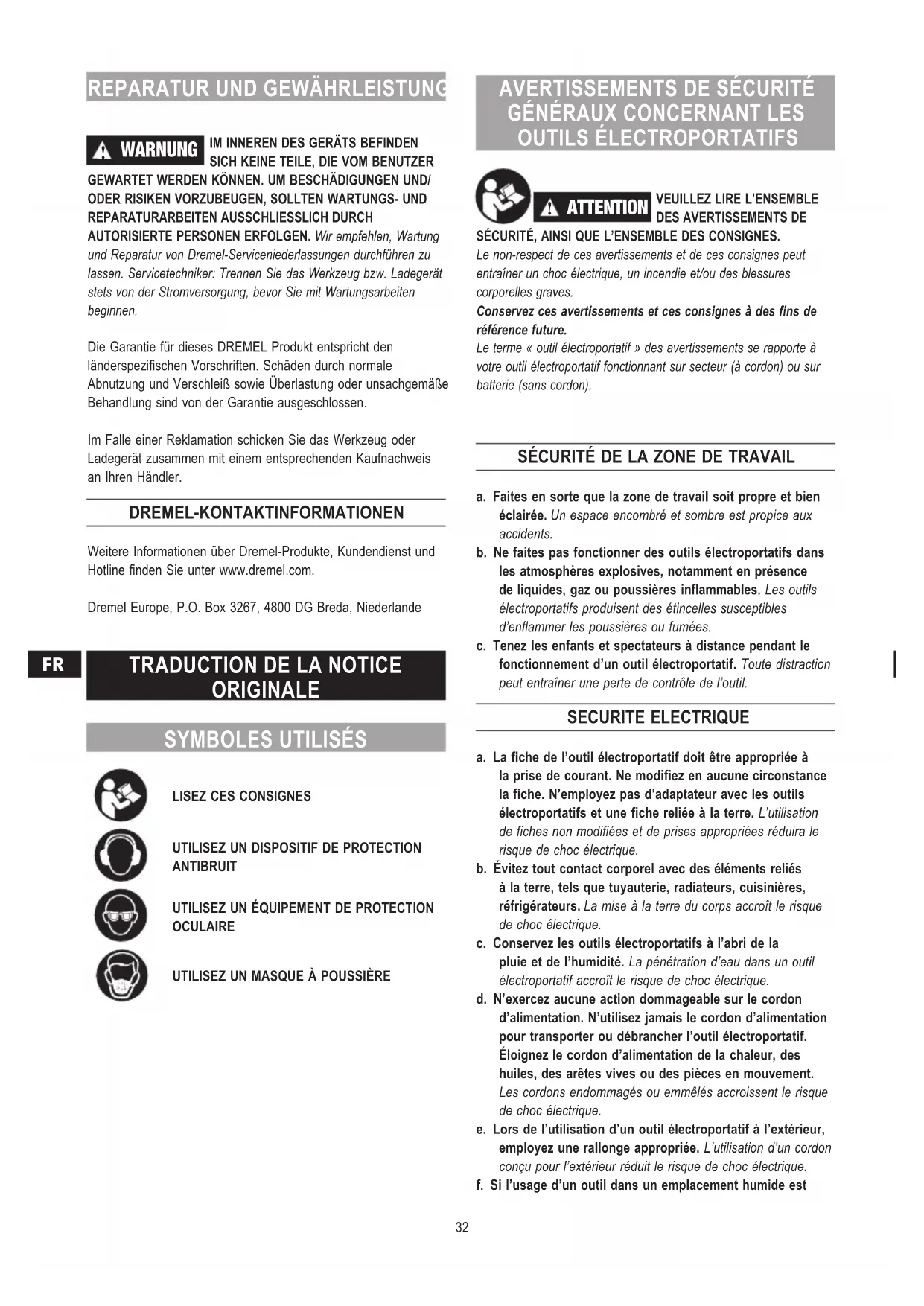 PRÉSENTER DES RISQUES GRAVES. Nous recommandons de confier les opérations d’entretien de l’outil à un Centre Technique Dremel. À l’attention du personnel de dépannage : Débranchez l’outil et/ou le chargeur de la sous-alimentation avant toute opération de dépannage. Ce produit DREMEL fait l’objet d’une garantie conforme aux réglementations légales en vigueur dans votre pays ; les dommages résultant de l’usure normale, d’une surcharge ou d’une utilisation inappropriée sont exclus de la garantie. En cas de réclamation, envoyez l’outil ou le chargeur non démonté avec le justificatif d’achat à votre revendeur. CONTACTER DREMEL Pour plus d’informations sur la gamme de produits, le support technique et l’assistance téléphonique de la société Dremel, visitez le site www.dremel.com. Dremel Europe, P.O. Box 3267, 4800 DG Breda, Pays-Bas