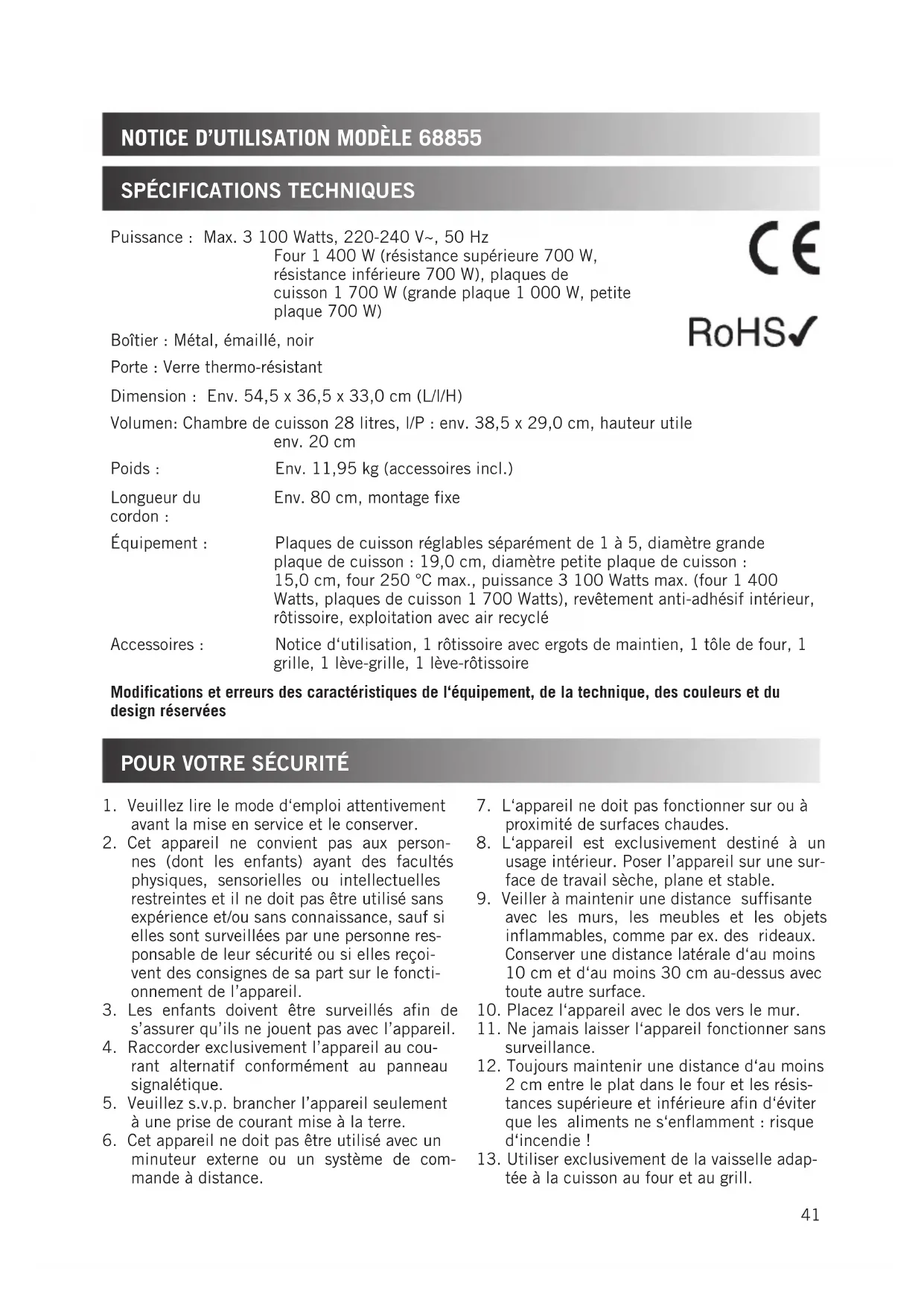 tée à la cuisson au four et au grill. Puissance : Max. 3 100 Watts, 220-240 V~, 50 Hz Four 1 400 W (résistance supérieure 700 W, résistance inférieure 700 W), plaques de cuisson 1 700 W (grande plaque 1 000 W, petite plaque 700 W) Boîtier : Métal, émaillé, noir Porte : Verre thermo-résistant Dimension : Env. 54,5 x 36,5 x 33,0 cm (L/l/H) Volumen: Chambre de cuisson 28 litres, l/P : env. 38,5 x 29,0 cm, hauteur utile env. 20 cm Poids : Env. 11,95 kg (accessoires incl.) Longueur du cordon : Env. 80 cm, montage fixe Équipement : Plaques de cuisson réglables séparément de 1 à 5, diamètre grande plaque de cuisson : 19,0 cm, diamètre petite plaque de cuisson : 15,0 cm, four 250 °C max., puissance 3 100 Watts max. (four 1 400 Watts, plaques de cuisson 1 700 Watts), revêtement anti-adhésif intérieur, rôtissoire, exploitation avec air recyclé Accessoires : Notice d‘utilisation, 1 rôtissoire avec ergots de maintien, 1 tôle de four, 1 grille, 1 lève-grille, 1 lève-rôtissoire Modifications et erreurs des caractéristiques de l‘équipement, de la technique, des couleurs et du design réservées42