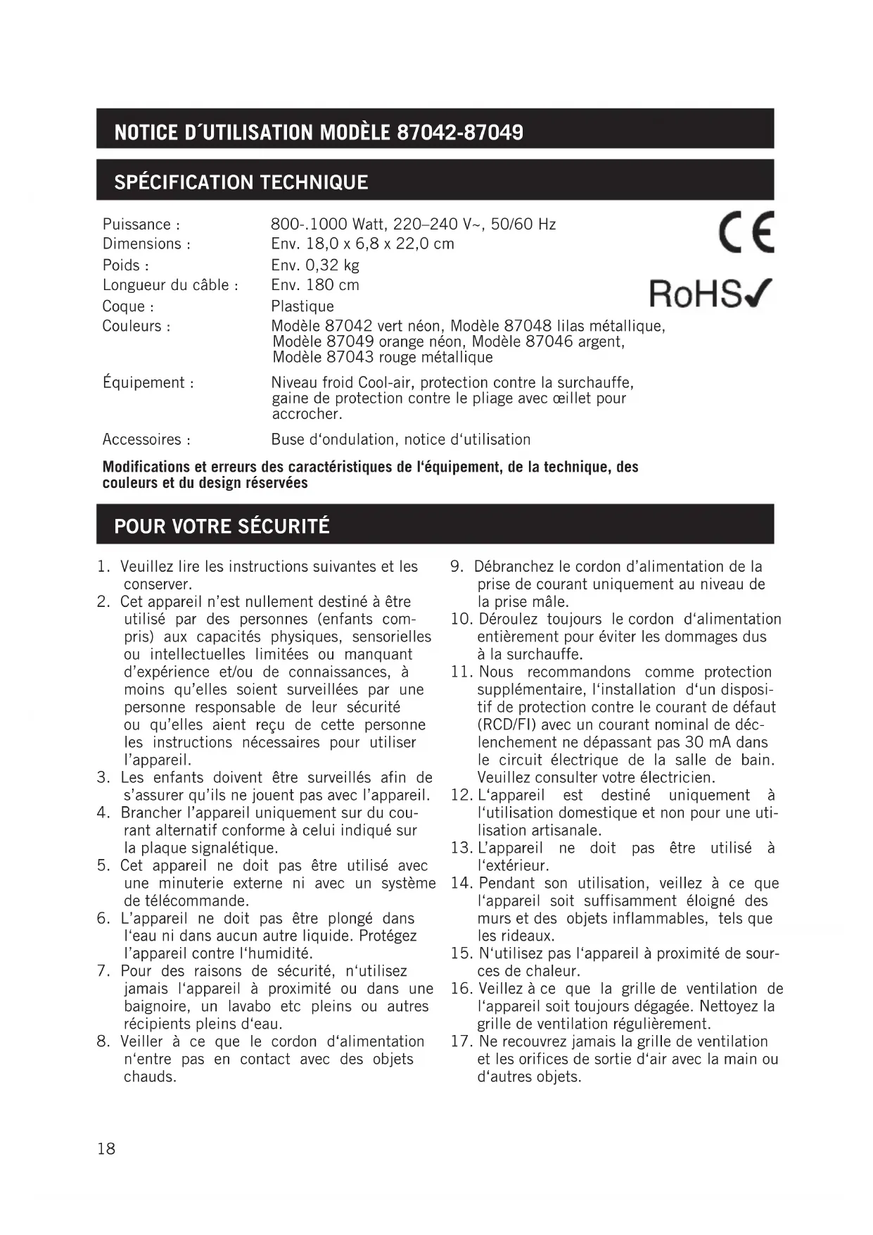 Notice d´utilisation Modèle 87042-87049