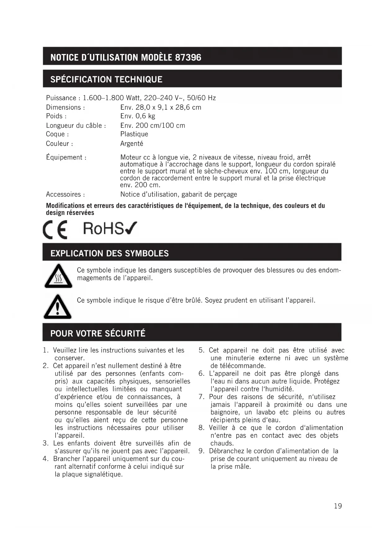 Wall 87396 - Sèche-cheveux UNOLD - Notice d'utilisation et mode d'emploi gratuit