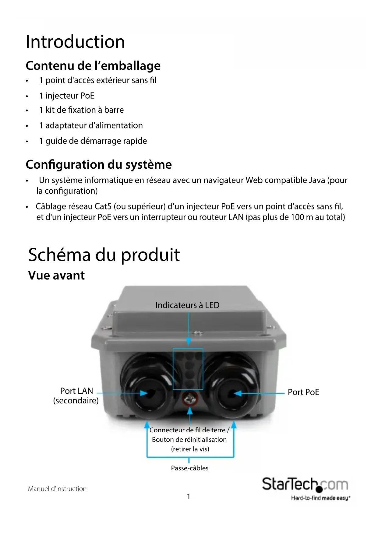 - Utilisation des marques de commerce, marques déposées et autres noms et symboles protégés Il peut arriver que ce manuel fasse référence à des marques de commerce, à des marques de commerce déposées et à d’autres noms ou symboles protégés de sociétés sans lien avec StarTech.com. Dans ce cas, ces références ne constituent que des exemples et ne correspondent en aucun cas à l’approbation d’un produit ou d’un service par StarTech.com, ni à la promotion du ou des produits au moyen du manuel de la société tierce en question. Indépendamment de toute mention directe dans le texte de ce document, StarTech.com reconnaît par la présente que toutes les marques de commerces, marques déposées, marques de service et autres noms ou symboles protégés mentionnés dans ce manuel et les documents associés sont la propriété de leurs détenteurs respectifs. Avis important Ce produit DOIT être installé par un installateur professionnel qui connaît les réglementations locales en matière de construction et de sécurité, le cas échéant, et est autorisé par les autorités compétentes. L'installateur professionnel est responsable de s'assurer que la mise à la terre est disponible et qu'elle respecte les codes électriques locaux et nationaux pertinents. Le défaut d'employer un installateur professionnel peut annuler la garantie du produit et exposer l'utilisateur nal ou le fournisseur de services à des responsabilités juridiques et nancières. StarTech.com décline expressément toute responsabilité pour les blessures, les dommages ou la violation de la réglementation en raison d'une mauvaise installation des unités extérieures ou des antennes. N'oubliez jamais de protéger le point d'accès en installant des lignes de mise à la terre, car cela est nécessaire pour protéger vos installations extérieures contre la foudre et l'accumulation d'électricité statique. Le point d'accès doit être mis à la terre correctement avant la mise sous tension, car la mise à la terre directe d'un point d'accès extérieur est essentielle et doit être eectuée correctement pour protéger vos réseaux des environnements extérieurs diciles et des décharges d’électricité statique destructives. ATTENTION: Assurez-vous que la mise à la terre est disponible et qu'elle respecte les codes électriques locaux et nationaux. En cas de doute, consultez toujours un électricien qualié pour vous assurer que l'installation extérieure est correctement mise à la terre. Pour une protection supplémentaire contre la foudre, des paratonnerres, des parafoudres ou des parasurtenseurs RJ45 peuvent être utilisés pour compléter l'installation.Manuel d’instruction iiManuel d’instruction iii Contenu Introduction p. 1