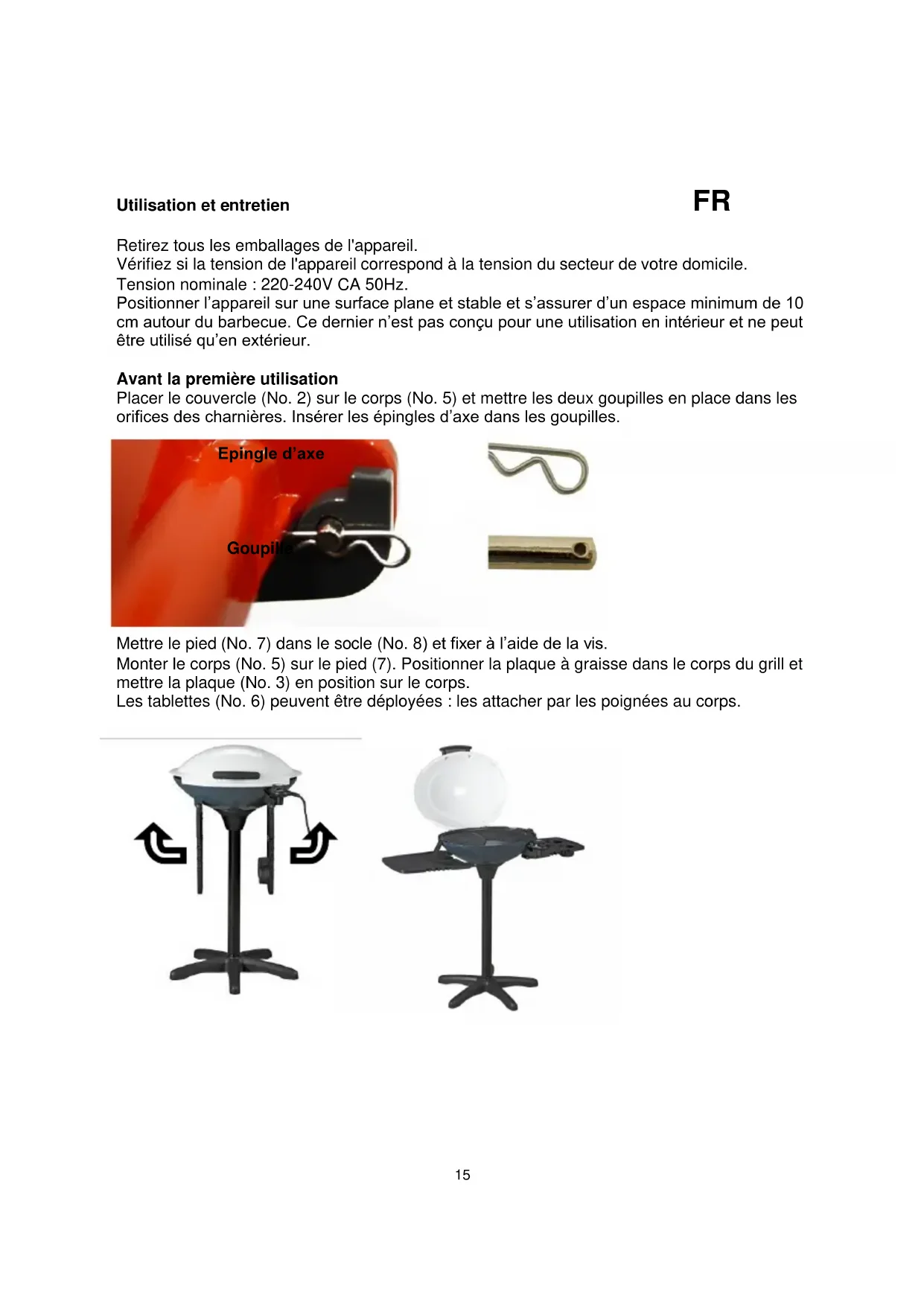 Positionner l'appareil sur une surface plane et stable et s'assurer d'un espace minimum de 10 cm autour du barbecue. Ce dernier n'est pas conçu pour une utilisation en intérieur et ne peut être utilisé qu'en extérieur.