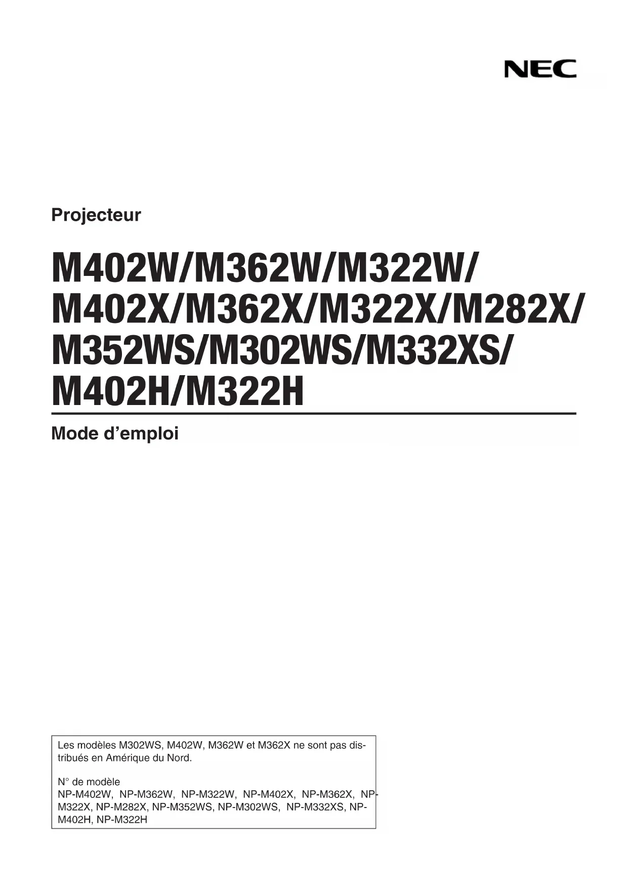 Projecteur M402W/M362W/M322W/ M402X/M362X/M322X/M282X/ M352WS/M302WS/M332XS/ M402H/M322H Mode d’emploi Les modèles M302WS, M402W, M362W et M362X ne sont pas dis- tribués en Amérique du Nord. N° de modèle NP-M402W, NP-M362W, NP-M322W, NP-M402X, NP-M362X, NP- M322X, NP-M282X, NP-M352WS, NP-M302WS, NP-M332XS, NP- M402H, NP-M322HVer.5 11/14