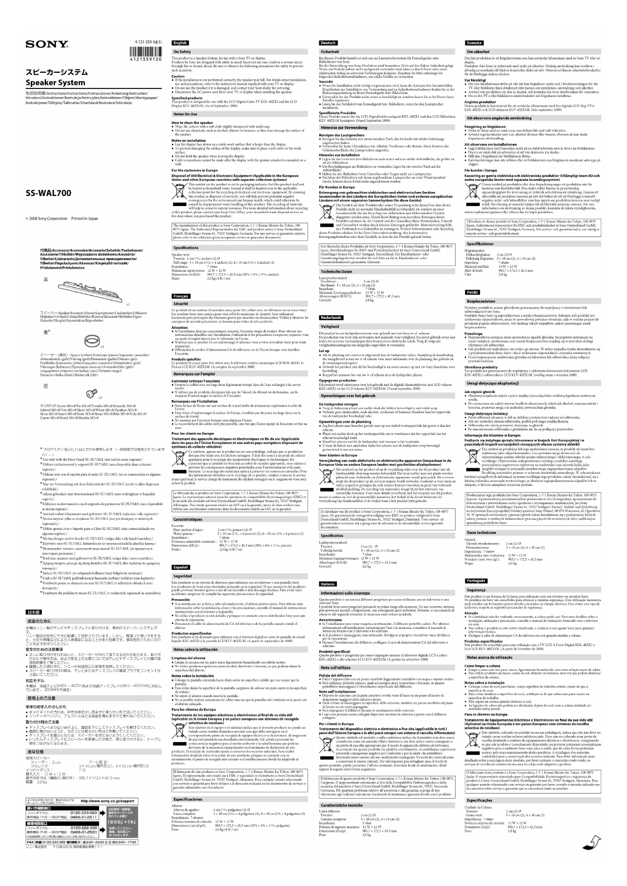 Retrouvez gratuitement la notice de l'appareil SSWAL700 SONY au format PDF.