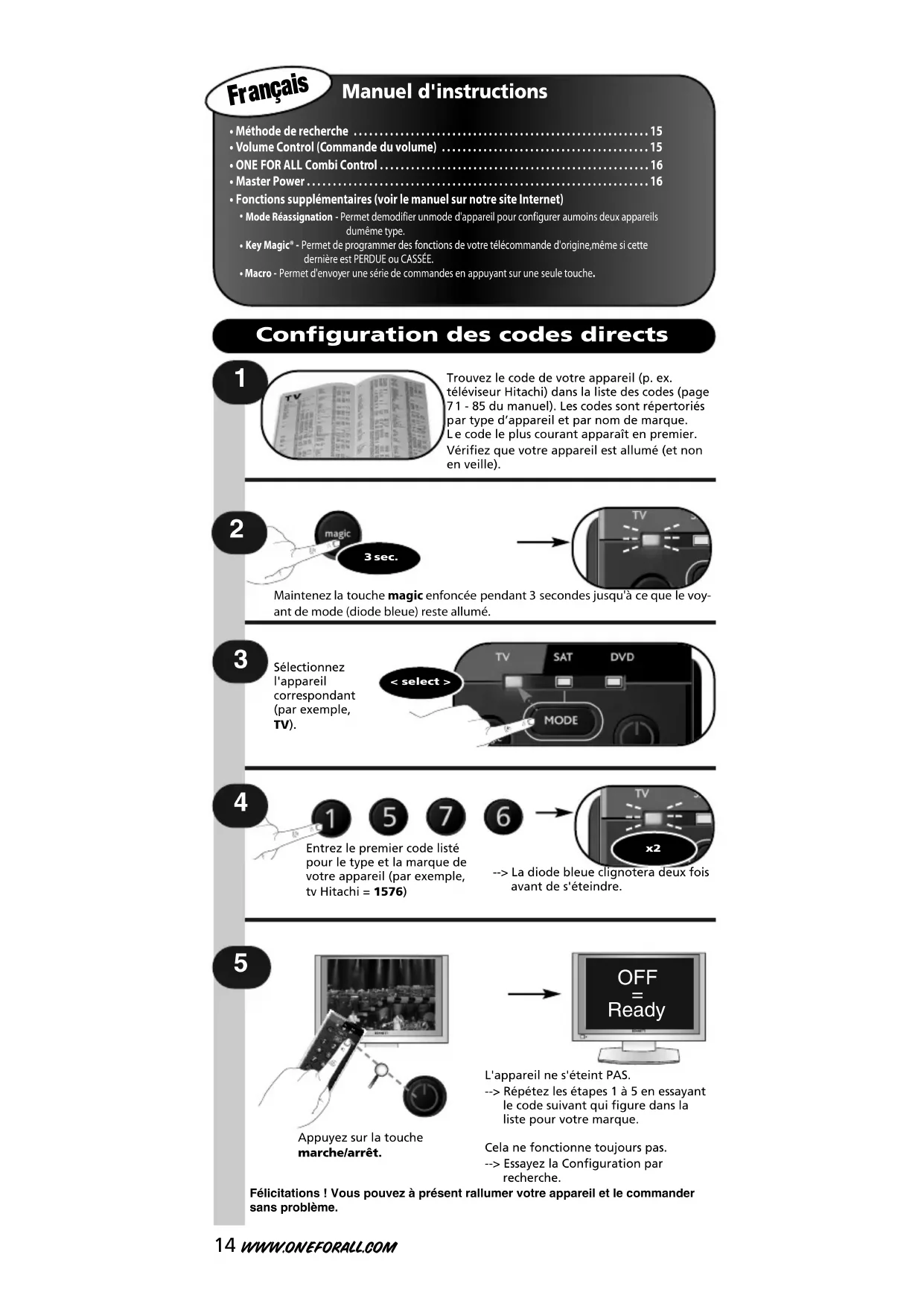 5 Trouvez le code de votre appareil (p. ex.téléviseur Hitachi) dans la liste des codes (page 7 1 - 85 du manuel). Les codes sont répertoriés p ar type d’appareil et par nom de marque. L e code le plus courant apparaît en premier.Vérifiez que votre appareil est allumé (et nonen veille). Maintenez la touche magic enfoncée pendant 3 secondes jusqu'à ce que le voy- ant de mode (diode bleue) reste allumé.Entrez le premier code listépour le type et la marque devotre appareil (par exemple,tv Hitachi = 1576)--> La diode bleue clignotera deux foisavant de s'éteindre.L'appareil ne s'éteint PAS.--> Répétez les étapes 1 à 5 en essayantle code suivant qui figure dans la liste pour votre marque.Cela ne fonctionne toujours pas.--> Essayez la Configuration parrecherche. < select >Sélectionnez l'appareilcorrespondant(par exemple,TV). 3 sec. 2