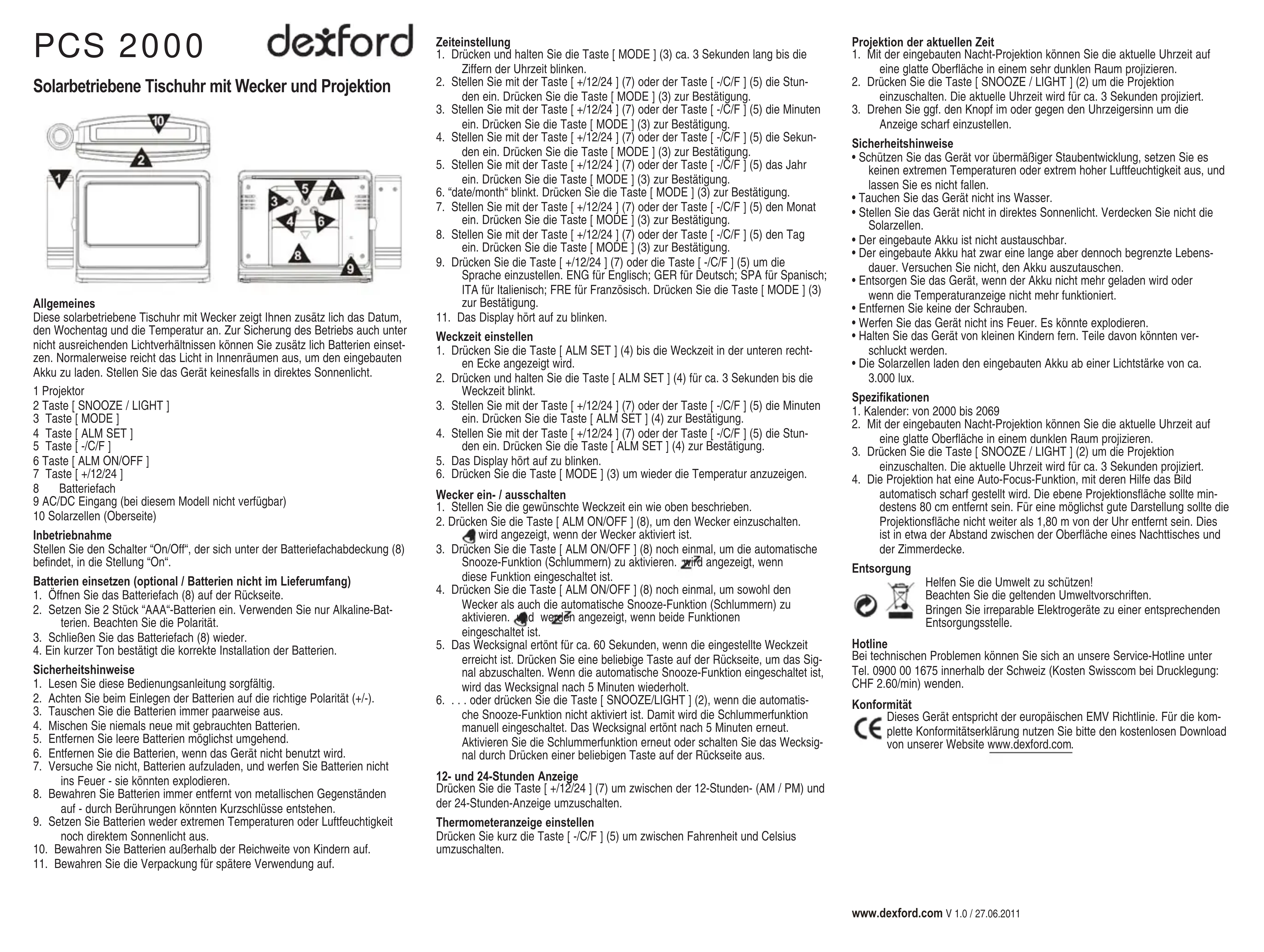 Cette horloge de bureau radio-pilotée avec fonction réelil revail affiche également la date, le jour de la sommei et la temperature. L'horloge peut également fonctionner avec des pilles, afin de garantir son bon fonctionnement, et ce, même par manque de lumière. En règle générale, la lumière interieure est suffisante pour recharger la batterie intégrée. Ne jamais exposer l'appareil au soleil direct Les Sonnentlich.