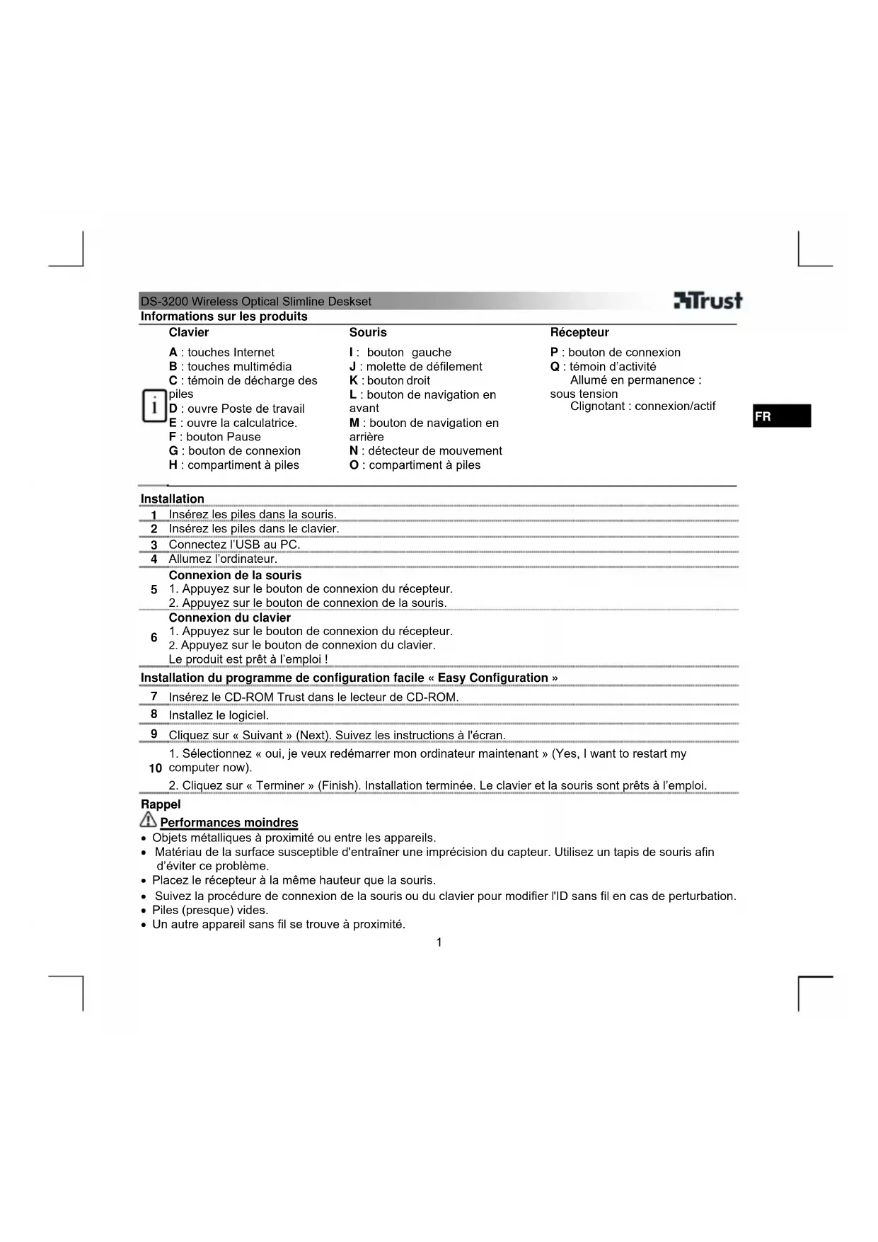 - Toute reproduction de ce manuel, en totalité ou en partie, est interdite sans l’autorisation de Trust International B.V.DS-3200 Wireless Optical Slimline Deskset