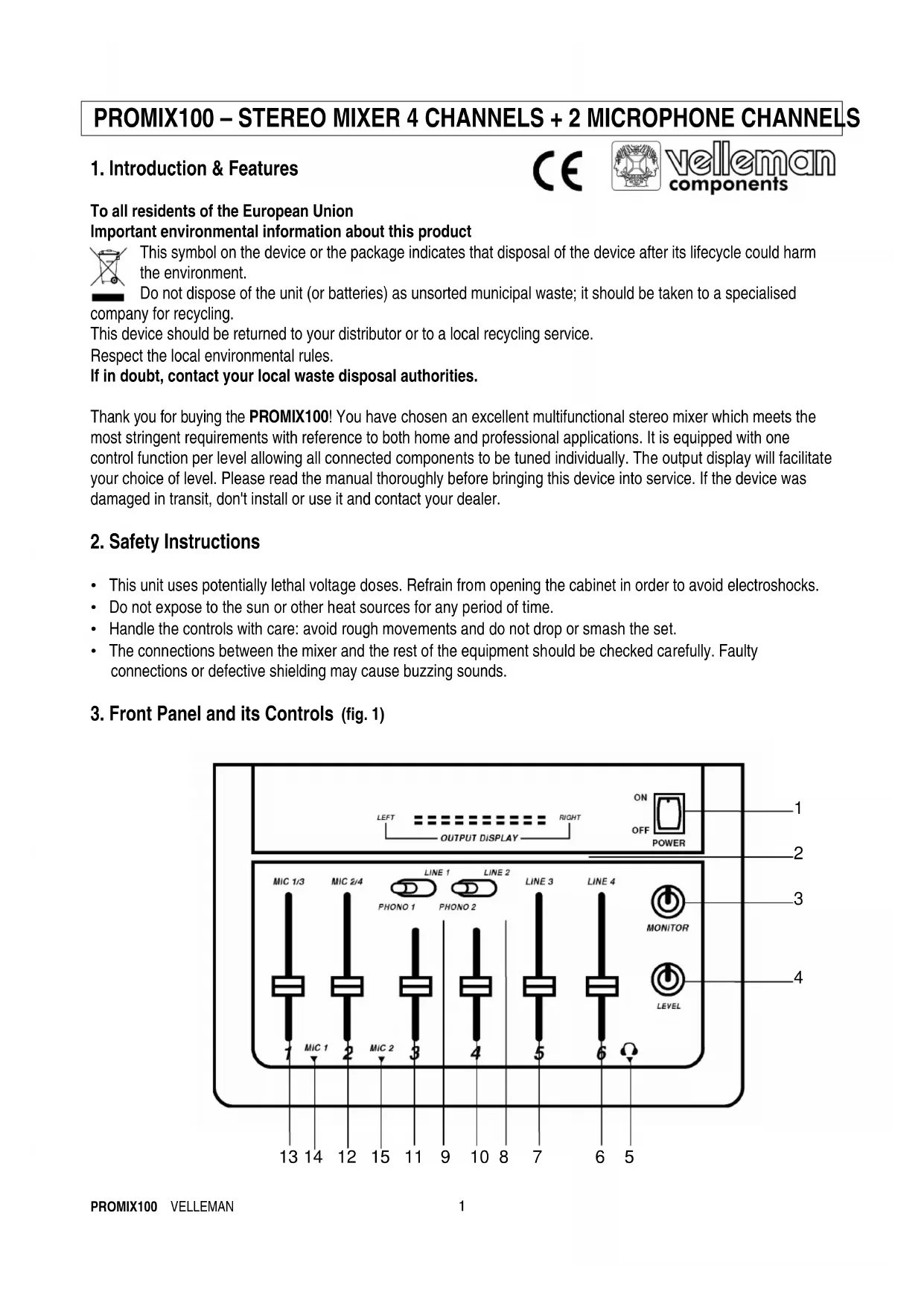 Aux résidents de l'Union Européenne Des informations environnementales importantes concernant ce produit Ce symbole sur l'appareil ou l'emballage indique que, si l'appareil est jeté après sa vie, il peut nuire à l'environnement. Ne jetez pas cet appareil (et des piles éventuelles) parmi les déchets ménagers; il doit arriver chez une firme spécialisée pour recyclage. Vous êtes tenu à porter cet appareil à votre revendeur ou un point de recyclage local. Respectez la législation environnementale locale. Si vous avez des questions, contactez les autorités locales pour élimination.PROMIX100 VELLEMAN