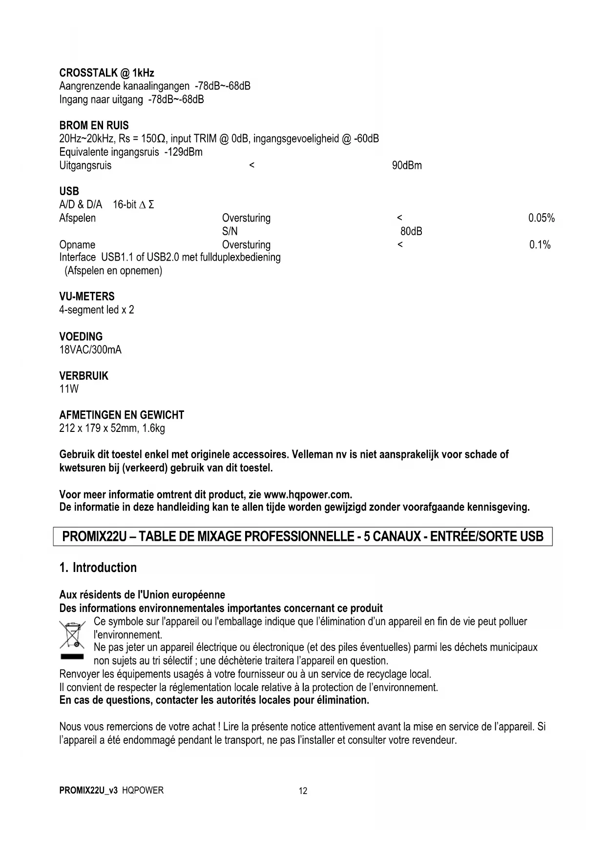 212 x 179 x 52mm, 1.6kg N’employer cet appareil qu’avec des accessoires d’origine. SA Velleman ne sera aucunement responsable de dommages ou lésions survenus à un usage (incorrect) de cet appareil. Pour plus d’information concernant cet article, visitez notre site web www.hqpower.com. Toutes les informations présentées dans cette notice peuvent être modifiées sans notification préalable. PROMIX22U – MESA DE MEZCLAS PROFESIONAL - 5 CANALES - ENTRADA/SALIDA USB