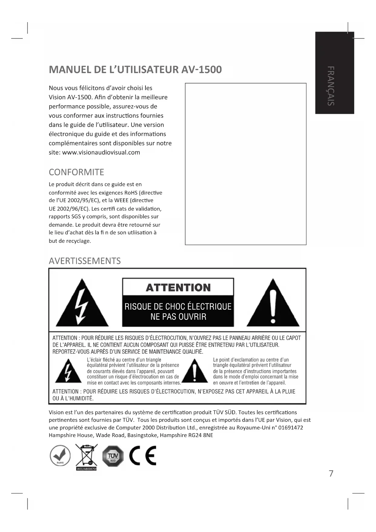 Vision est l’un des partenaires du système de cercaon produit TÜV SÜD. Toutes les cercaons pernentes sont fournies par TÜV. Tous les produits sont conçus et importés dans l’UE par Vision, qui est une propriété exclusive de Computer 2000 Distribuon Ltd., enregistrée au Royaume-Uni n° 01691472 Hampshire House, Wade Road, Basingstoke, Hampshire RG24 8NEWEE/AB0047SYATTENTION : POUR RÉDUIRE LES RISQUES D’ÉLECTROCUTION, N’OUVREZ PAS LE PANNEAU ARRIÈRE OU LE CAPOTDE L’APPAREIL. IL NE CONTIENT AUCUN COMPOSANT QUI PUISSE ÊTRE ENTRETENU PAR L’UTILISATEUR.REPORTEZ-VOUS AUPRÈS D’UN SERVICE DE MAINTENANCE QUALIFIÉ.
