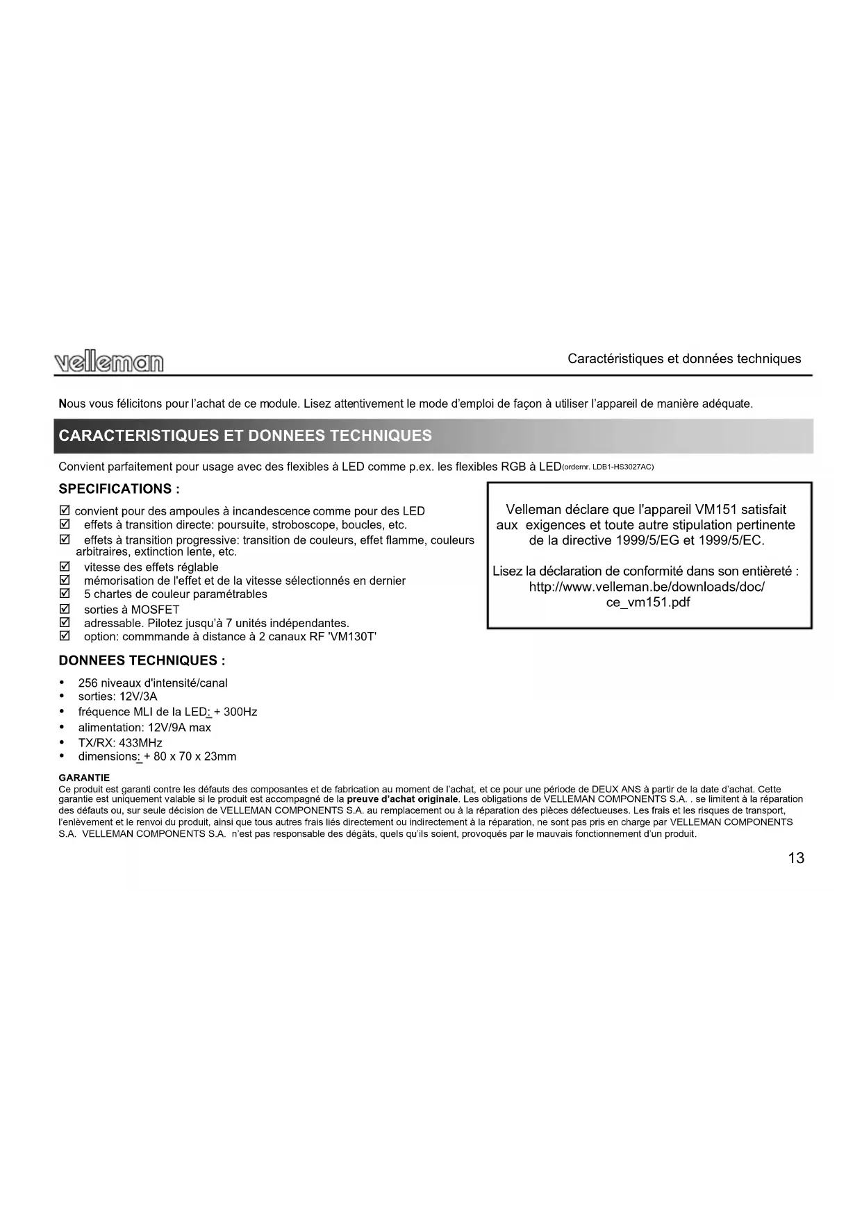 Velleman declare que l'appareil VM151 satisfait aux exigences et toute autre stipulation pertinente de la directive 1999/5/EG et 1999/5/EC.