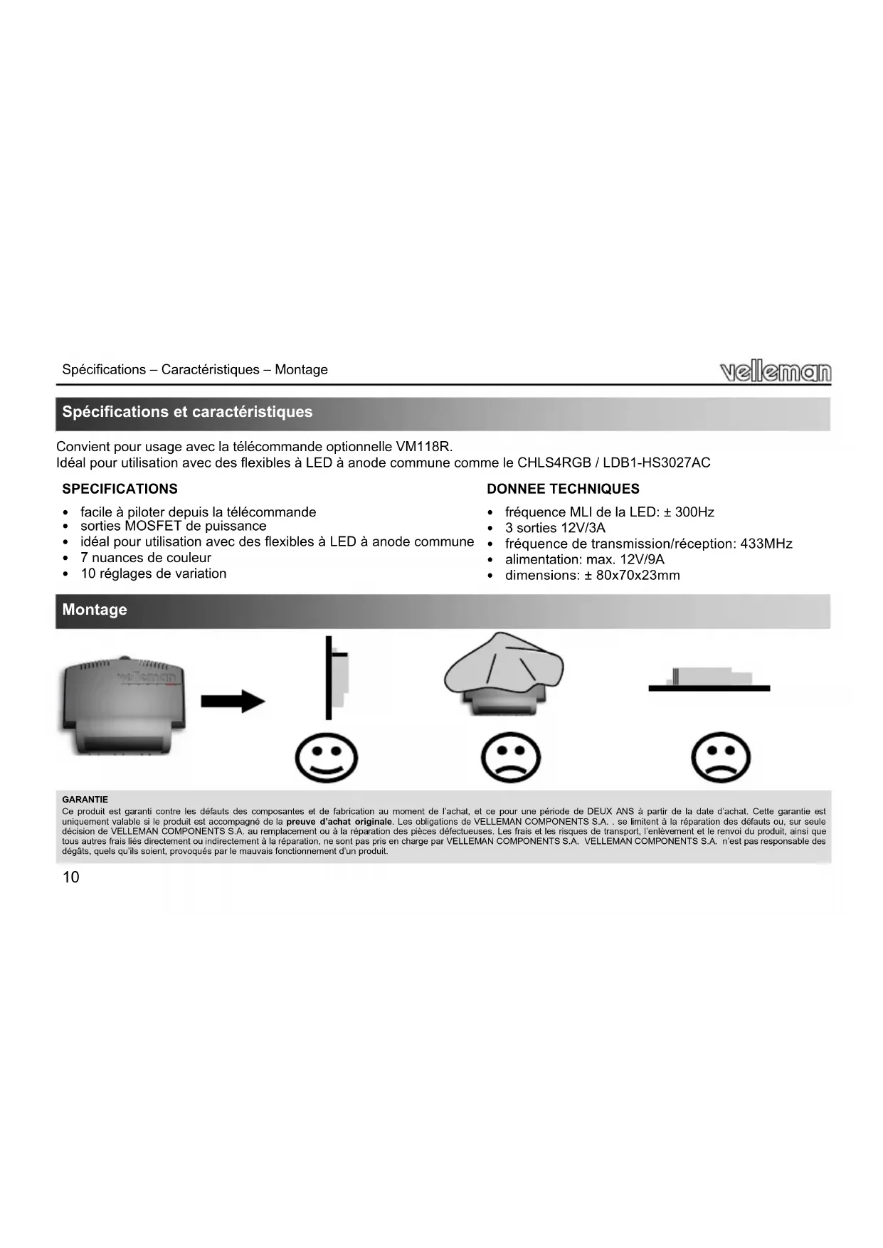 Ce produit est garanti contre les defauts des composantes et de fabrication au moment de l'achat, et ce pour une periode de DEUX ANS à partir de la date d'achat. Cette garantie est unquivalent valable si le produit est accompagne de la preuve d'achat originale. Les obligations de VELLEMAN COMPONENTS S.A., se limitent à la réparation des défauts ou, sur seule décision de VELLEMAN COMPONENTS S.A. au remplacement ou à la réparation des pièces défectueuses. Les frais et les risques de transport, l'enlevement et le renvoi du produit, ainsi que tous autres frais liés directement ou indirectement à la réparation, ne sont pas pris en charge par VELLEMAN COMPONENTS S.A. VELLEMAN COMPONENTS S.A. n'est pas responsable des dégats, quels quils soient, provoques par le mauvais fonctionnement d'un produit.