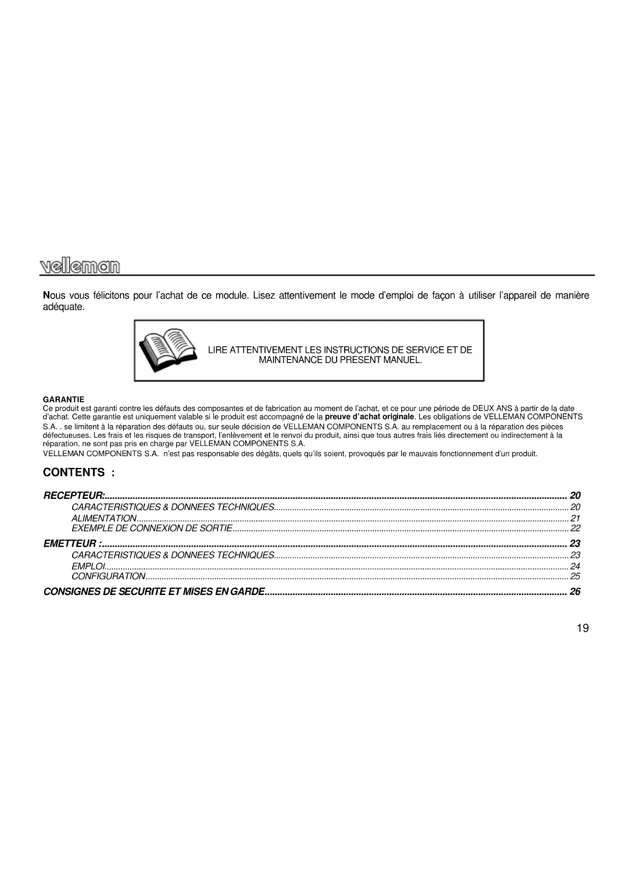 GARANTIE Ce produit est garanti contre les défauts des composantes et de fabrication au moment de l’achat, et ce pour une période de DEUX ANS à partir de la date d’achat. Cette garantie est uniquement valable si le produit est accompagné de la preuve d’achat originale. Les obligations de VELLEMAN COMPONENTS S.A... se limitent à la réparation des défauts ou, sur seule décision de VELLEMAN COMPONENTS S.A. au remplacement ou à la réparation des pièces défectueuses. Les frais et les risques de transport, l’enlèvement et le renvoi du produit, ainsi que tous autres frais liés directement ou indirectement à la réparation, ne sont pas pris en charge par VELLEMAN COMPONENTS S.A. VELLEMAN COMPONENTS S.A. n’est pas responsable des dégâts, quels qu’ils soient, provoqués par le mauvais fonctionnement d’un produit. CONTENTS :