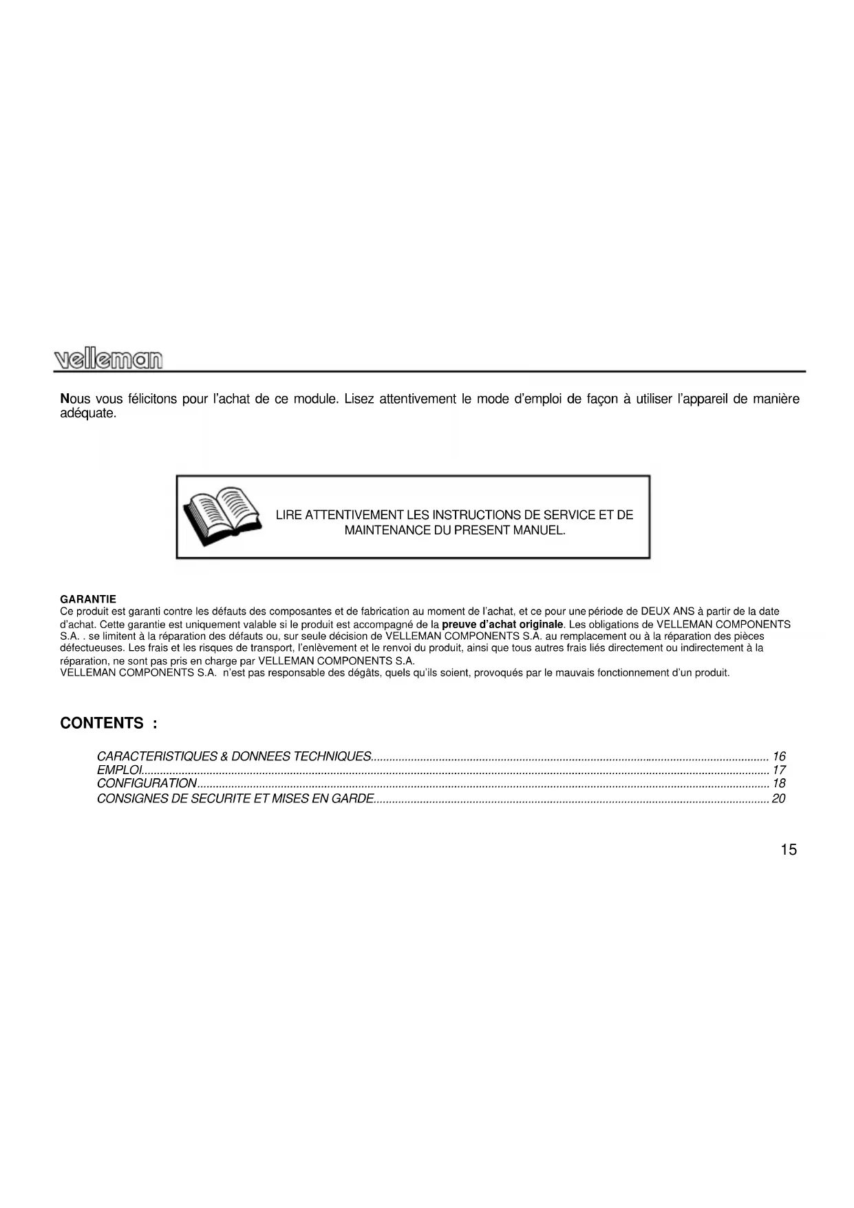 GARANTIE Ce produit est garanti contre les défauts des composantes et de fabrication au moment de l’achat, et ce pour une période de DEUX ANS à partir de la date d’achat. Cette garantie est uniquement valable si le produit est accompagné de la preuve d’achat originale. Les obligations de VELLEMAN COMPONENTS S.A. . se limitent à la réparation des défauts ou, sur seule décision de VELLEMAN COMPONENTS S.A. au remplacement ou à la réparation des pièces défectueuses. Les frais et les risques de transport, l’enlèvement et le renvoi du produit, ainsi que tous autres frais liés directement ou indirectement à la réparation, ne sont pas pris en charge par VELLEMAN COMPONENTS S.A. VELLEMAN COMPONENTS S.A. n’est pas responsable des dégâts, quels qu’ils soient, provoqués par le mauvais fonctionnement d’un produit.