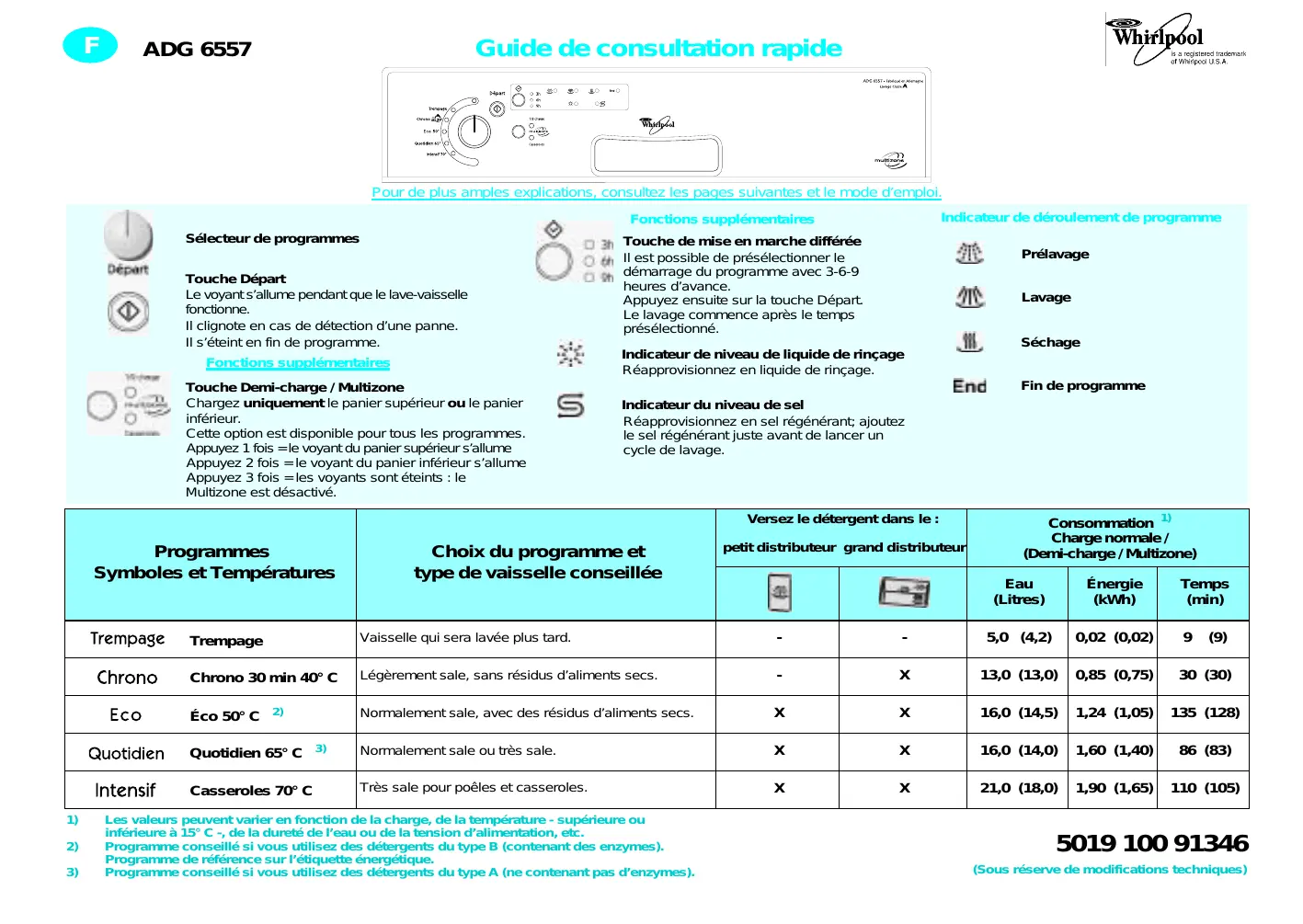 ADG 6557 WHM - TABLEAU DE PROGRAMMES - Lave-vaisselle WHIRLPOOL - Notice d'utilisation et mode d'emploi gratuit