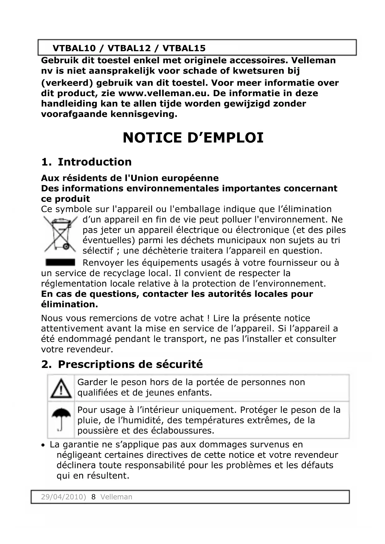 VTBAL15 - Balance VELLEMAN - Notice d'utilisation et mode d'emploi gratuit