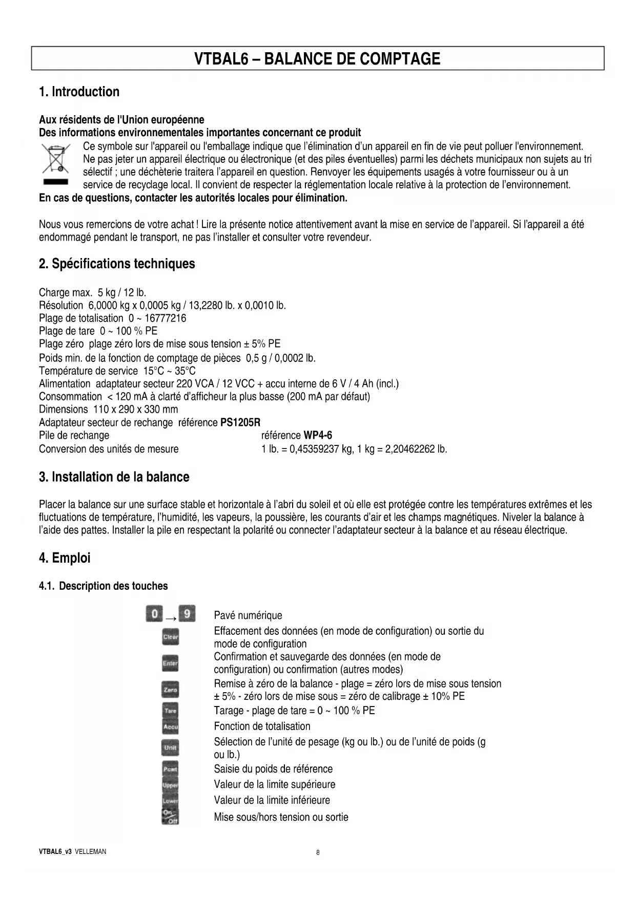 VTBAL6 - Balance VELLEMAN - Notice d'utilisation et mode d'emploi gratuit