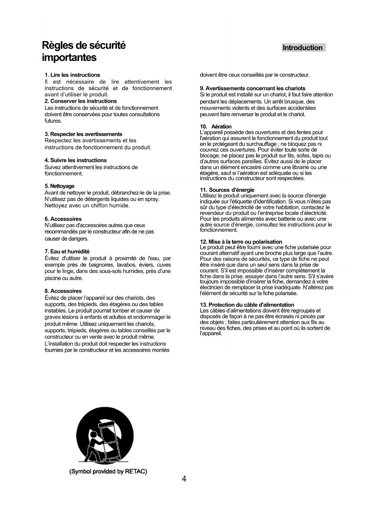 Les câbles d’alimentations doivent être regroupés et disposés de façon à ne pas être écrasés ni pincés par des objets ; faites particulièrement attention aux fils au niveau des fiches, des prises et au point où ils sortent de l’appareil. Introduction 4Règles de sécurité importantes