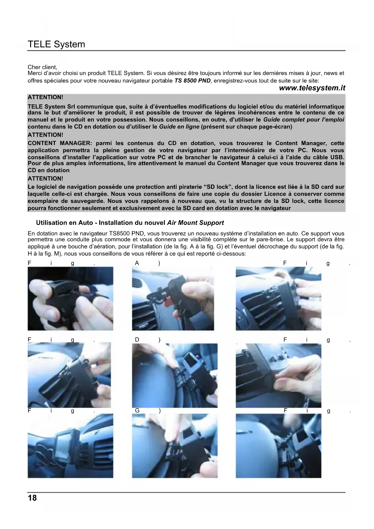 - TELESystem ne répond d'aucun éventuel dommage causé par l'utilisateur lors de l'installation et de la désinstallation du TS8500 PND sur le véhicule