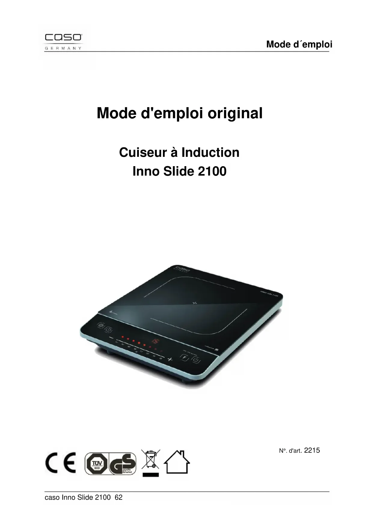 caso Inno Slide 2100 62 Mode d'emploi original Cuiseur à Induction Inno Slide 2100 N°. d'art. 2215Généralités caso Inno Slide 2100 63 21 Mode d´emploi