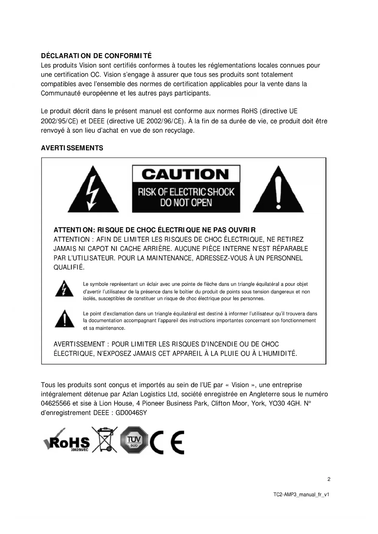 Retrouvez gratuitement la notice de l'appareil TC2AMP3 VISION au format PDF.