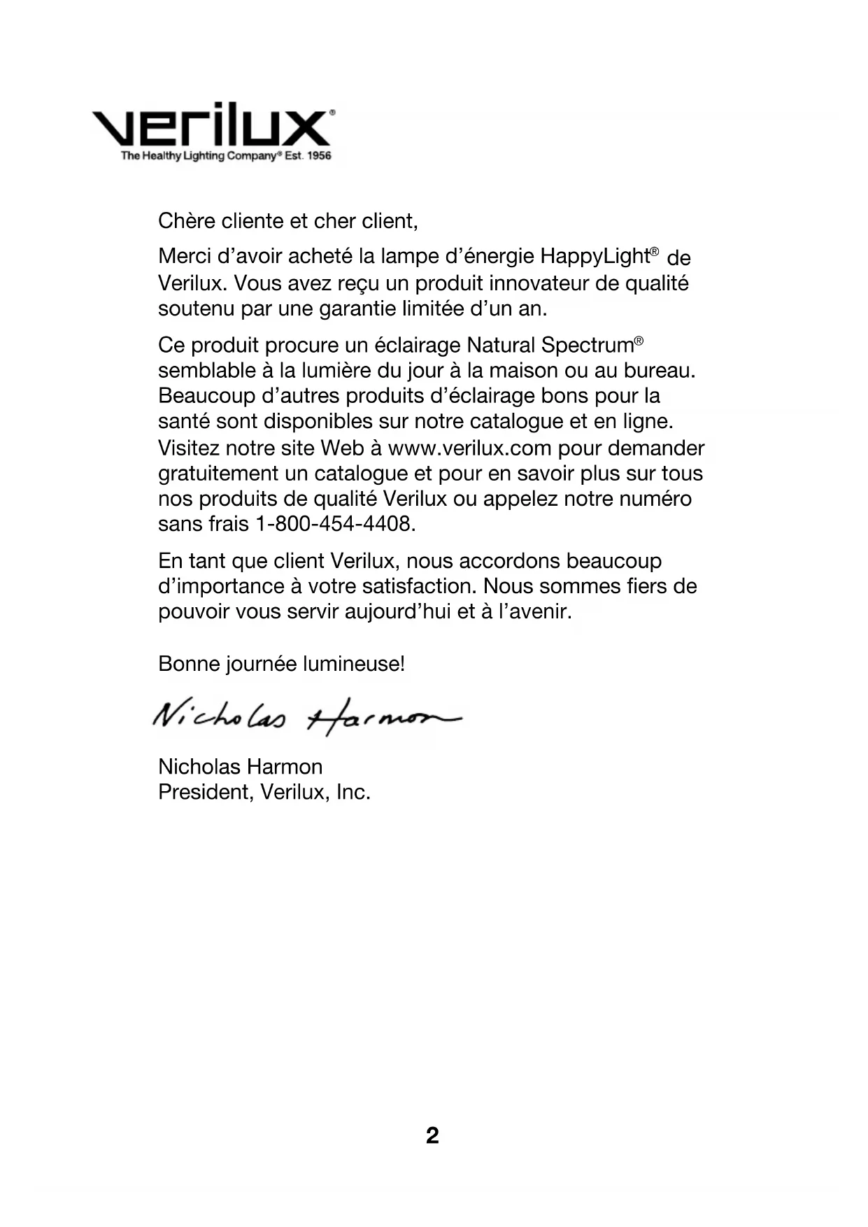 Verilux. Vous avez reçu un produit innovateur de qualité soutenu par une garantie limitée d’un an. Ce produit procure un éclairage Natural Spectrum