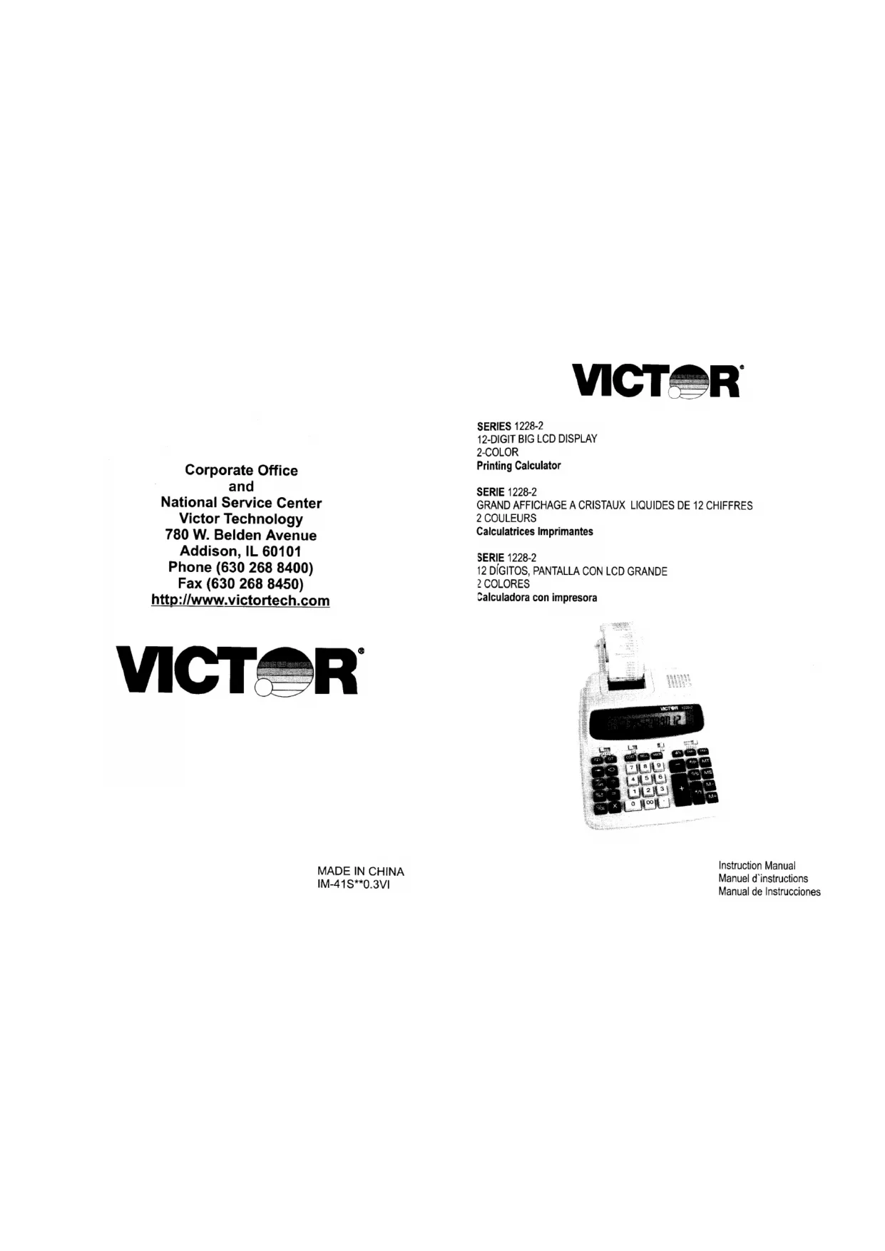 Vivre nouvelle calculatrice électronique VICTOR est garantie au premier acheteur pendant une période de deux ans pour toutes les pieces et la main d'oeuvre, a condition que les réparations soient effectues dans un Centre de service régional VICTOR autorisé et que l'apparéil soit envoyé par courrier affranchi. Pour les Centres de service situés à l'extérieur des États-Unis, veuillus ne consultuer vos distributeur de fournitures de bureau local ou le site Web de Victor. Pour qu'une réparation soit couverte par la garantie, il faut Jointir la facture ou le reçu d'achat avec l'apparéil.