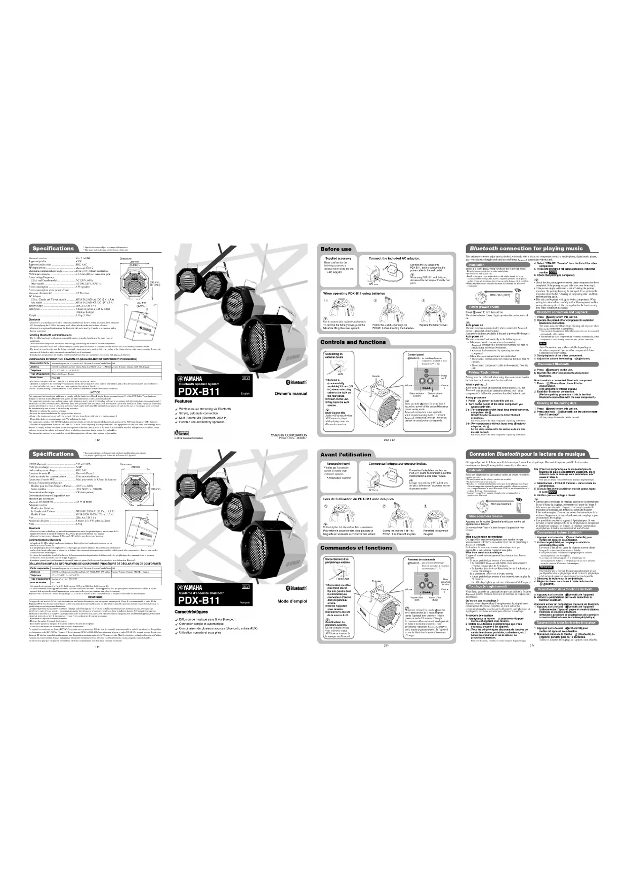 AUX 1 Connect a (commercially available) 3.5 mm (1/8 in.) stereo mini plug cable to the AUX on the rear panel.2 Power on the unit.3 Play back the AUX source.Multi-Source Mix Audio will be mixed when AUX source is played while playing music via Bluetooth connection. Bluetooth connection for playing music This unit enables you to enjoy music playback wirelessly with a Bluetooth component (such as a mobile phone, digital music player, etc.) which is paired (registered) and has established Bluetooth connection with this unit.HandleControl panelPower on/offVolume + Vous devez procéder au couplage lorsque vous utilisez la fonction Bluetooth pour la première fois ou si les données de couplage ont été effacées.Qu’est-ce que le couplage ?Reportez-vous à la procédure d’enregistrement de périphériques, notamment de téléphones portables, en vue d’activer les communications Bluetooth (ci-après dénommés « périphériques »). Appliquez la procédure suivante pour effectuer le couplage.Procédure de couplage1 Appuyez sur la touche (marche/arrêt) pour mettre cet appareil sous tension.2 Mettez sous tension le périphérique que vous souhaitez coupler à cet appareil.3-a [Pour les périphériques disposant de touches de saisie (téléphones portables, ordinateurs, etc.)] Activez le périphérique en vue de détecter les périphériques Bluetooth. Pour plus de détails, consultez le mode d’emploi du périphérique.3-b [Pour les périphériques ne disposant pas de touches de saisie (adaptateurs Bluetooth, etc.)]Activez le mode de couplage sur le périphérique, puis passez à l’étape 6. Pour plus de détails, consultez le mode d’emploi du périphérique.4 Sélectionnez « PDX-B11 Yamaha » dans la liste du périphérique.5 Si vous êtes invité à saisir un mot de passe, tapez le code . 6 Vérifiez que le couplage a réussi.• Vérifiez que la procédure de couplage a réussi sur le périphérique. En cas d’échec du couplage, recommencez à partir de l’étape 3.• Si la source qui alimente cet appareil est coupée pendant la procédure de couplage, les données de couplage risquent d’être endommagées. Dans ce cas, suivez les instructions de la section « Suppression de toutes les données de couplage », puis recommencez le couplage.• Il est possible de coupler cet appareil à 8 périphériques. Si vous parvenez à coupler cet appareil à un 9e périphérique en enregistrant les données de couplage, les données de couplage correspondant au périphérique le moins récemment utilisé sont effacées. Connexion et lecture Bluetooth 1 Appuyez sur la touche (marche/arrêt) pour mettre cet appareil sous tension.2 Activez le périphérique couplé pour établir la connexion Bluetooth.Le voyant d’état (Bleu) cesse de clignoter et reste allumé lorsque la connexion Bluetooth est établie.• Vous pouvez sauter cette étape si le périphérique se connecte automatiquement lors du couplage.• La connexion entre cet appareil et le périphérique est automatiquement établie si le périphérique choisi est le dernier à avoir été connecté (Connexion Automatique).RemarqueIl est possible que la fonction de connexion automatique ne soit pas disponible selon le périphérique utilisé. Activez le périphérique si la fonction de connexion automatique n’est pas disponible.3 Démarrez la lecture sur le périphérique.4 Réglez le niveau de volume à l’aide de la touche / (volume). Désactivation de la fonction Bluetooth a Appuyez sur la touche (Bluetooth) de l’appareil.b Activez le périphérique en vue de désactiver la fonction Bluetooth.Comment activer un périphérique connecté via Bluetooth1 Appuyez sur la touche (Bluetooth) de l’appareil à déconnecter (l’appareil passe en mode d’attente). 2 Établissez la connexion Bluetooth.(effectuez la procédure de couplage lors de la première connexion Bluetooth avec le nouveau périphérique). Suppression de toutes les données de couplage 1 Appuyez sur la touche (marche/arrêt) pour mettre cet appareil sous tension.2 Maintenez enfoncée la touche (Bluetooth) de l’appareil pendant plus de 10 secondes. Toutes les données de couplage de l’appareil sont effacées.Raccordement d’un périphérique externe