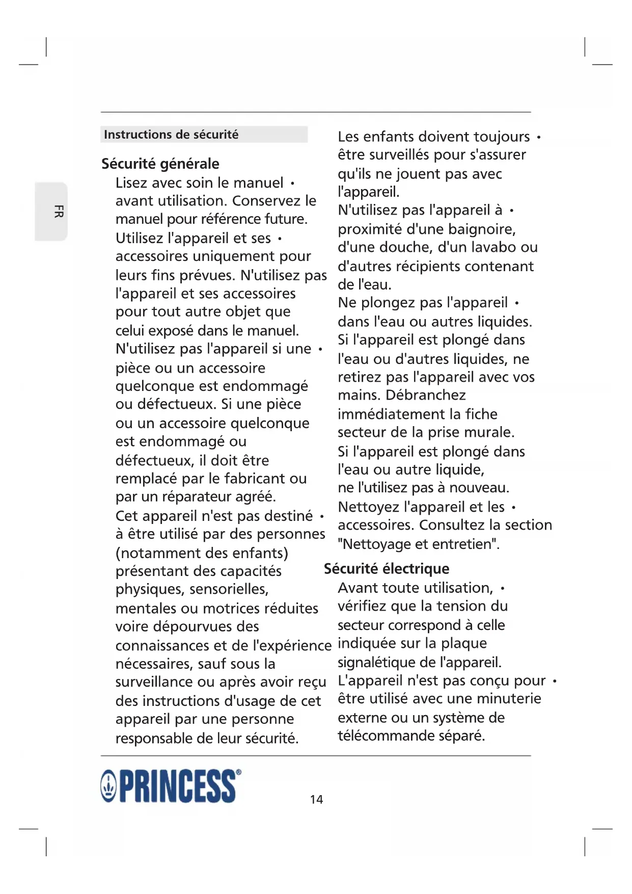 pendant l'utilisation, le nettoyage et l'entretien. Attention aux pièces coupantes. • Éloignez vos mains des parties coupantes. L'appareil emploie des lames aiguisées pour les accessoires de mixage et de hachage. Attention aux pièces chaudes. • Attendez que l'appareil ait suffisamment refroidi avant de toucher le carter ou ses autres pièces. L'appareil peut devenir chaud pendant l'usage. Faites spécialement attention • durant le nettoyage et la maintenance. Faites spécialement attention en vidant le bol mixeur et le conteneur de hachage. Faites extrêmement attention en manipulant la lame effilée. Ne laissez jamais l'appareil sans • surveillance pendant l'utilisation. Nettoyage et entretien (fig. A & B) L’appareil doit être nettoyé après chaque utilisation. Avertissement ! - Avant le nettoyage ou l'entretien, arrêtez l'appareil, débranchez la fiche secteur de la prise murale et attendez que l'appareil refroidisse. - Ne plongez pas l'appareil dans l'eau ou autres liquides. Attention ! - N'utilisez pas de produits de nettoyage agressifs ou abrasifs pour nettoyer l'appareil. - Ne nettoyez pas l'appareil avec des objets coupants. - Ne nettoyez pas l'unité moteur, l'accessoire de mixage, l'accessoire de hachage et l'accessoire de fouet au lave-vaisselle. Contrôlez régulièrement les éventuels • dommages sur l'appareil. Nettoyez l'unité moteur (4) avec un chiffon • doux et humide. Séchez soigneusement l'unité moteur (4) avec un chiffon propre et sec. Nettoyez les accessoires :• - Applications de mixage : Nettoyez l'accessoire de mixage (6) sous l'eau courante (fig. B1). Nettoyez le bol mixeur (7) et le couvercle (8) à l'eau savonneuse ou au lave-vaisselle. Rincez le bol mixeur (7) et le couvercle (8) sous l'eau courante. - Applications de hachage : Nettoyez l'accessoire de hachage (9) sous l'eau courante (fig. B2). Nettoyez la lame de hachage (10), le conteneur de hachage (11) et le couvercle (12) à l'eau savonneuse ou au lave-vaisselle. Rincez la lame de hachage (11), le conteneur de hachage (12) et le couvercle (13) sous l'eau courante. - Applications de fouet : Nettoyez l'accessoire de fouet (13) sous l'eau courante (fig. B3). Nettoyez le fouet (14) à l'eau savonneuse ou au lave-vaisselle. Rincez le fouet (14) sous l'eau courante. - Séchez soigneusement les accessoires avec un chiffon propre et sec. Description (fig. A) Votre pied mixeur 221203 Princess a été conçu pour mixer, hacher et fouetter. L'appareil est réservé à un usage à l'intérieur. L'appareil est réservé à un usage domestique.