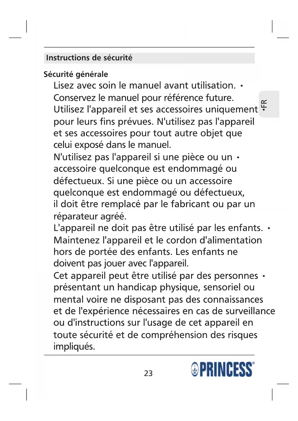 Instructions de sécurité Sécurité générale Lisez avec soin le manuel avant utilisation. • Conservez le manuel pour référence future. Utilisez l'appareil et ses accessoires uniquement • pour leurs fins prévues. N'utilisez pas l'appareil et ses accessoires pour tout autre objet que celui exposé dans le manuel. N'utilisez pas l'appareil si une pièce ou un • accessoire quelconque est endommagé ou défectueux. Si une pièce ou un accessoire quelconque est endommagé ou défectueux, il doit être remplacé par le fabricant ou par un réparateur agréé. L'appareil ne doit pas être utilisé par les enfants. • Maintenez l'appareil et le cordon d'alimentation hors de portée des enfants. Les enfants ne doivent pas jouer avec l'appareil. Cet appareil peut être utilisé par des personnes • présentant un handicap physique, sensoriel ou mental voire ne disposant pas des connaissances et de l'expérience nécessaires en cas de surveillance ou d'instructions sur l'usage de cet appareil en toute sécurité et de compréhension des risques impliqués.24