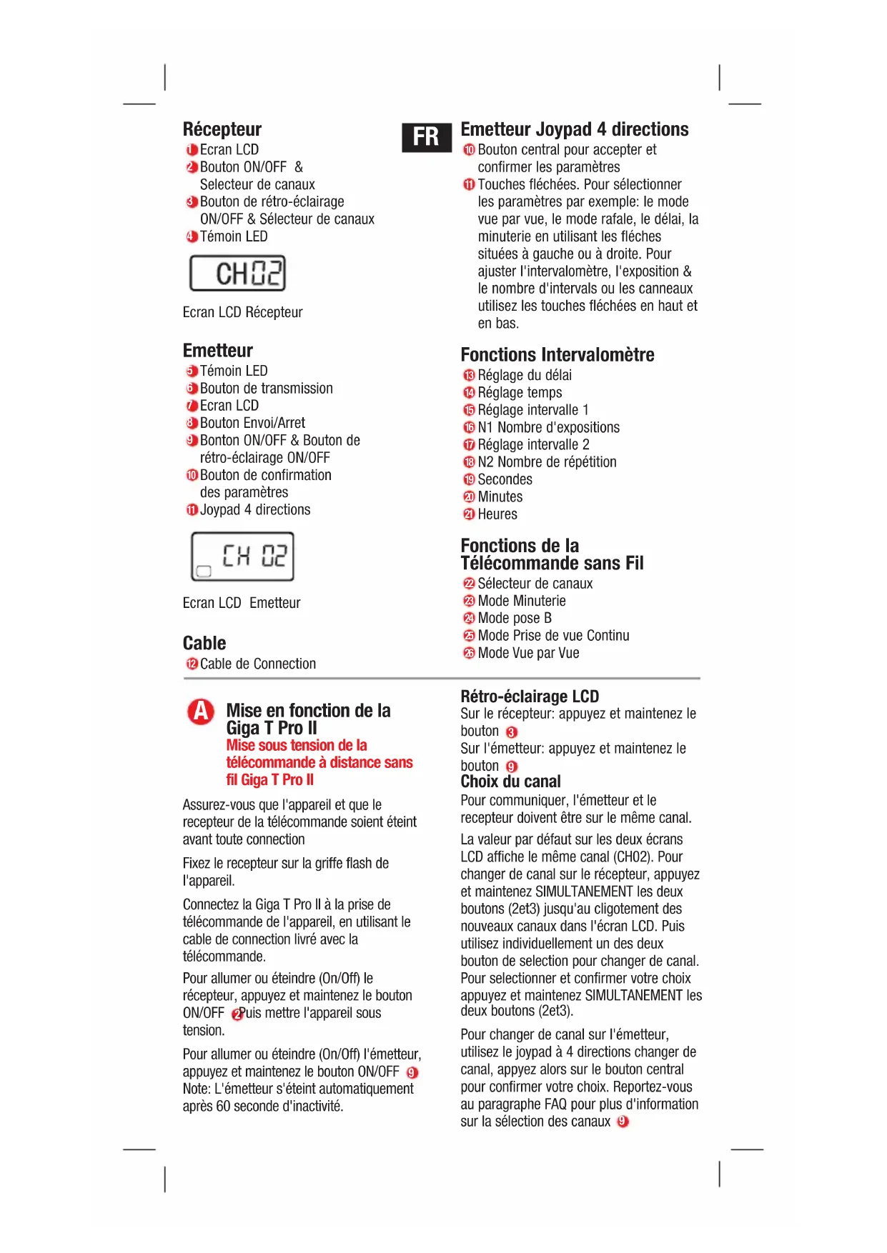 FRFonctions standards de la télécommande Mode vue par vueAssurez-vous que l'appareil est bien en modevue par vue. Reportez-vous au mode d'emploide l'apparei.Utilisez le joypad 4 directions, et mettrel'émetteur en mode vue per vue (Single Shot).Pour que la mise au point automatique soitassurée veillez à ce que l'autofocus soit enfonction.Appuyez à mi-course sur le bouton del'émetteur. Un lumière verte sur l'émetteur et lerecepteur indiquent que l'autofocus est actif.Appuyez à fond sur le bouton pour déclencherl'obturateur. Une lumière rouge sur l'émetteuret le recepteur indiquent que la prise de vue aété enregistrée.Mode rafaleAssurez-vous que l'appareilest bien en mode continu.Mettre l'émetteur en mode prise de vueen continu.Appuyez à mis course pour obtenir lamise au point automatique.Appuyez à fond et maintenez le bouton del'émetteur. L'appareil effectuera desprises de vue en rafalle tant que le boutonsera maintenu.Pose B - Temps de pose longAssurez-vous que l'appareil est bien enmode B (Bulb).Mettre l'émetteur en mode B.Appuyez à mis course pour obtenir lamise au point automatique.Appuyez à fond sur le bouton pour ouvrirl'obturateur. L'affichage témoigne dutemps d'ouverture de l'obturateur.Appuyez à nouveau sur le bouton pourrefermer l'obturateur et stoper l'affichage. Mode minuterie de base Pour définir un certain nombre de prise devue avec un délai bien spécifique avantl'enregistrement de la première image.Assurez-vous que l'appareil est bien enmode vue par vue.Assurez-vous que l'émetteur est bien enmode minuterie (Basic Timer Mode).Appyez sur le bouton central. Utilisez lejoypad 4 directions pour sélectionner lenombre de vues puis le délai entrechaque vue. Appuyez alors sur le boutoncentral pour confirmer votre choix.Appuyez à mis course sur le bouton del'émetteur.Appuyez à fond sur le bouton del'émetteur.L'appareil fera la mise au point entrechaque prise de vue. Reportez-vous auparagraphe FAQ pour supprimerl'autofocus Fonctions minuterie programmable avec interval Pour programmer la Giga T Pro II en modeintervallomètre, vous devez définir lesvaleurs pour le mode de “minuterie debase” en imputant le délai, le temps depose, l'interval1et le nombre d'intervals N1.Pour répéter ce “programme de base”définissez les valeurs de la fréquence etl'interval entre chaque séquence enutilisant l'interval 2 and le paramètre N2 .Les réglages de l'appareil pourront affecterces fonctions. Pour une série en vue parvue assurz-vous que l'appareil est biendans ce mode de fonctionnement.Pour les prises de vue en rafale assurez-vous que l'appareil est bien en modecontinu.Pour les temps de pose long assurez-vousque l'appareil est bien en pose B (Bulb). Delai: Le temps en heures, minutes et secondes doitêtre défini avant lecommencement de laprogrammation.Utilisez le joypad 4 directions pour