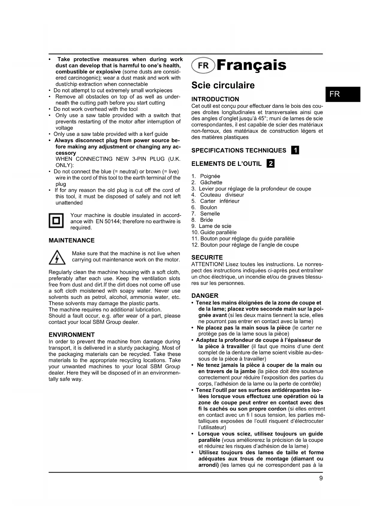 Sierra circular INTRODUCCIÓNEsta herramienta ha sida proyectada para efectuar cortes longitudinales y transversales rectos y con un ángulo de inglete hasta 45° en madera; al emplear las hojas de sierra correspondientes pueden aserrarse también materiales no férricos, materiales de construc-ción ligeros y materiales sintéticosCARACTERISTICAS TECNICAS 1 ELEMENTOS DE LA HERRAMIENTA 2 1. Empuñadura2. Gatillo3. Palanca (ajuste de la profundidad de corte)4. Cuchilla5. Chapa protectora6. Tornillo de hoja7. Base8. Brida9. Hoja de sierra10. Guía paralela11. Botón (ajuste de la guía paralela)12. Botón (ajuste del ángulo de corte)SEGURIDAD¡ATENCIÓN! Lea íntegramente estas instrucciones. En caso de no atenerse a las instrucciones de segu-ridad siguientes, ello puede dar lugar a una descarga eléctrica, incendio o lesión seria. El término “herra-mienta eléctrica” empleado en las siguientes instruc-ciones se refi ere a su aparato eléctrico portátil, ya sea con cable de red.PELIGRO• Mantenga las manos apartadas del área de corte y de la hoja; mantenga su mano auxiliar en el asa delantera (si ambas manos están sujetando la sierra, no pueden ser cortadas por la hoja)• No meta la mano debajo de la pieza de trabajo (la guarda no puede protegerle contra la hoja debajo de la pieza de trabajo)• Ajuste la profundidad de corte al grosor de la pie-za de trabajo (por debajo de la pieza de trabajo debe sobresalir al menos un diente de la hoja de sierra)• No sujete nunca la pieza que esté cortando con las manos o sobre la pierna (es importante sopor-tar la pieza de trabajo correctamente para minimizar la exposición del cuerpo, el atasco de la hoja o la pérdida de control)• Sujete la herramienta por las superfi cies de aga-rre aisladas cuando realice una operación en la que la herramienta de corte pueda hacer contac-to con alambres ocultos o su propio cable de ali-mentación (el contacto con un cable bajo tensión también conectará la corriente a la herramienta y dará una sacudida eléctrica al operario)• Enlevez tout corps étranger du tracé avant d’effec-tuer toute coupe• Ne jamais travaillez au-dessus de l’outil• Cet outil ne doit pas être utilisé par des personnes en dessous de 16 ans• Le niveau sonore en fonctionnement peut dépasser 85 dB(A); munissez-vous de casques anti-bruit• Si le câble est endommagé ou rompu pendant le tra-vail, ne pas y touchez, mais immédiatement débran-chez la prise• N’utilisez jamais d’outil avec un câble endommagé; faites-le remplacer par un technicien qualifi é• Toujours contrôlez si la tension secteur correspond à la tension indiquée sur la plaquette signalétique de l’outil (les outils conçus pour une tension de 230V ou 240V peuvent également être branchés sur 220V)• Cet outil ne convient pas pour couper à mouillage• Après avoir coupé la mise en marche de votre scie circulaire, ne jamais arrêtez la rotation de la lame de scie par une force latérale appliquée contre elle• Ne jamais utilisez de lame de scie circulaire faite en acier rapide (HSS)• Ne jamais utilisez de disques de meulage/tronçon-nage avec cet outil• Utilisez toujours une table de sciage livrée avec un interrupteur de sécurité pour éviter tout redémarrage intempestif• Utilisez toujours une table de sciage livrée avec un couteau diviseur• Toujours débranchez l’outil avec tout réglage ou changement d’accessoireLa machine est doublement isolée conformé-ment a la norme EN50144; un fi l de mise à la terre n’est pas donc pas nécessaire.ENTRETIENAssurez-vous que la machine n’est pas sous tension si vous allez procéder à des travaux d’entretien dans son système mécanique.Nettoyez régulièrement le carter au moyen d’un chif-fon doux, de préférence a Tissue de chaque utilisation. Veillez à ce que les fentes d’aération soient indemnes de poussière et de saletés.En présence de saleté tenace, employez un chiffon doux humecté d’eau savonneuse. Proscrivez l’emploi de solvants comme l’essence, l’alcool, l’ammoniaque etc. car ces substances attaquent les pièces en plas-tique. Cette machine ne nécessite pas de graissage supplémentaire.En cas de panne survenue par exemple à la suite de l’usure d’une pièce, contactez votre distributeur SBM Group local.ENVIRONNEMENTPour éviter les dommages liés au transport, la machine est livré dans un emballage robuste. L’emballage est autant que possible constitué de matériau recyclable. Veuillez par conséquent destiner cet emballage au recyclage.Si vous allez changer de machines, apportez les ma-chines usagées à votre distributeur SBM Group local qui se chargera de les traiter de la manière la plus éco-logique possible.