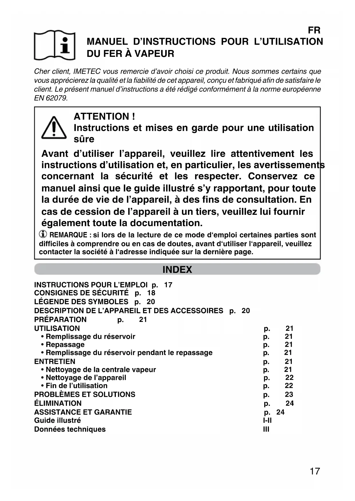 MANUEL D’INSTRUCTIONS POUR L’UTILISATION DU FER À VAPEUR Cher client, IMETEC vous remercie d’avoir choisi ce produit. Nous sommes certains que