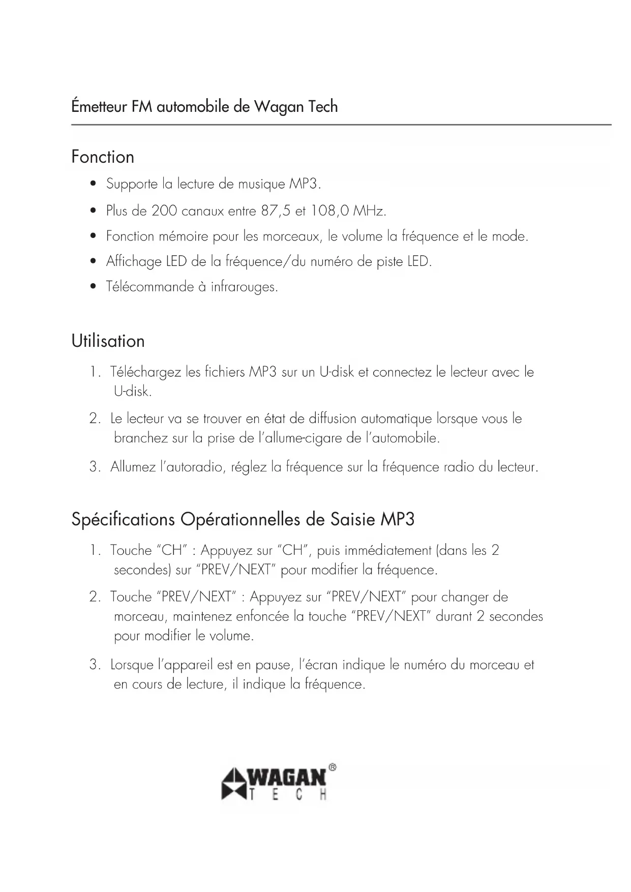 MODE D'EMPLOI Car FM Transmitter WAGAN