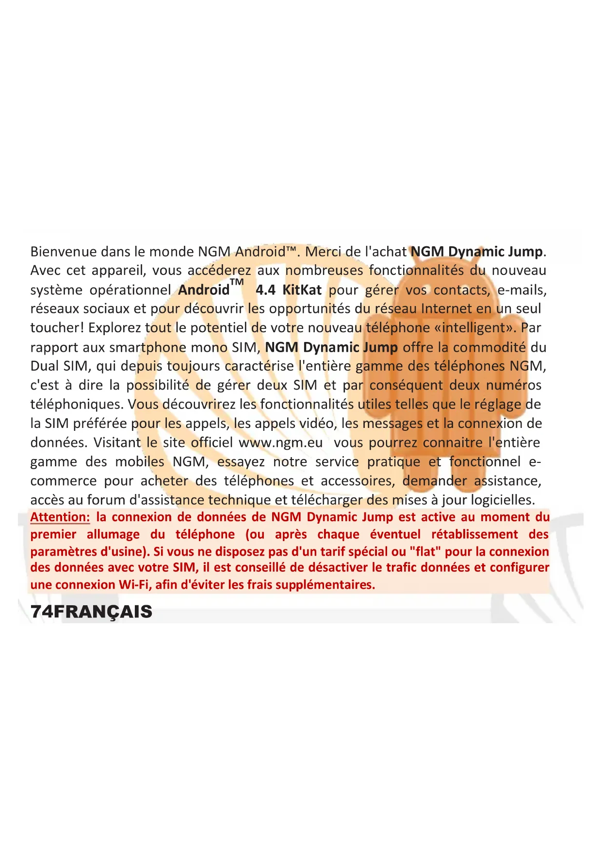 Note: il est possible utiliser comme sonneries des fichiers de format*mid,*wav ,ogg *mp3.86 FRANÇAIS Envoyer des SMS et MMS: de l'écran ou du menu principal, sélectionnez Messages dans le bas. Composez les premières lettres du nom dans le champ du destinataire pour rechercher un contact et le sélectionner en rubrique ou composez directement le numéro, ou sélectionnez près du champs et cochez le/les destinataires. Introduire le texte dans l'espace adéquat avec le clavier virtuel. Sélectionnez l'icône verte" + "pour y inclure les éventuelles pièces jointes multimédia (le message sera converti en MMS) et appuyez sur choisissant la SIM désirée. CONNECTIVITÉ: pour utiliser au mieux la potentialité offerte par le terminal et son système d'exploitation, il est nécessaire disposer d'une connexion de données active; la connexion de données de NGM Dynamic Jump est active au moment du premier allumage du téléphone. S'il n'est pas prévu par votre abonnement, le trafic de données implique des frais, nous vous conseillons donc de configurer l'accès Internet par le WiFi. Pour activer le trafic de données sur une des SIM, sélectionnez Paramètres > Gestion SIM > Connexion de données, ou l'activer appuyant sur paramètres rapides sur le panneau des notifications. Se connecter à Internet avec le WiFi® vous pouvez vous connectez au réseau WLAN utilisant le Wi-Fi. Pour l'activer, choisissez du menu principal Paramètres > WiFi. Respectez toutes les indications précisées par le personnel autorisé où l'utilisation d'appareils wireless est limitée (avions/hôpitaux). Passer en mode hors connexion lorsque vous devez utiliser uniquement les services qui ne nécessitent pas l'accès au réseau.87FRANÇAIS Se connectez à un dispositif Bluetooth®: allumez le dispositif Bluetooth auquel vous désirez vous connecter. Se référer à la documentation du dispositif. Dans le menu principal, sélectionnez Paramètres > Bluetooth on/off pour activer le Bluetooth. Dans le menu contextuel, vous trouverez les fonctions et paramètres supplémentaires. Choisir Rechercher les appareils pour démarrer automatiquement la recherche de dispositifs Bluetooth. Parmi les dispositifs détectés, sélectionner le nom du dispositif à associer. Le téléphone tentera de s'associer à l'appareil, il pourrait être demandé d'entrer un code d'appareillage. Se connecter à Internet: dans le menu principal, choisir Navigateur. Composer l'URL dans la barre d'adresse pour lancer la navigation. Si vous choisissez de naviguer utilisant la connexion de données du réseau téléphonique, informez vous des frais ou choisir un abonnement de données «flat» avec votre opérateur. En alternative, utilisez la connexion Wi-Fi (voir paragraphe "Connectivité"). Configuration compte: pour profiter au mieux des fonctionnalités du système Android