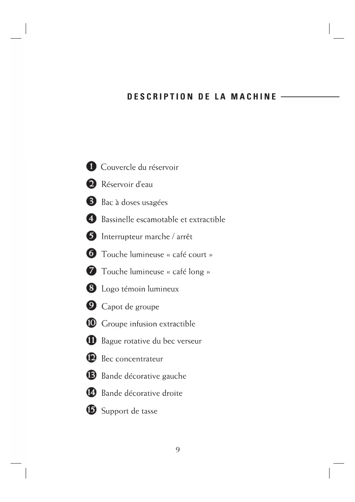 Veuillez lire attentivement les instructions et consignes de sécurité suivantes avant d’utiliser votre machine..89 Couvercle du réservoir Réservoir d’eau Bac à doses usagées Bassinelle escamotable et extractible Interrupteur marche / arrêt Touche lumineuse « café court » Touche lumineuse « café long » Logo témoin lumineux Capot de groupe Groupe infusion extractible Bague rotative du bec verseur Bec concentrateur Bande décorative gauche Bande décorative droite Support de tasse