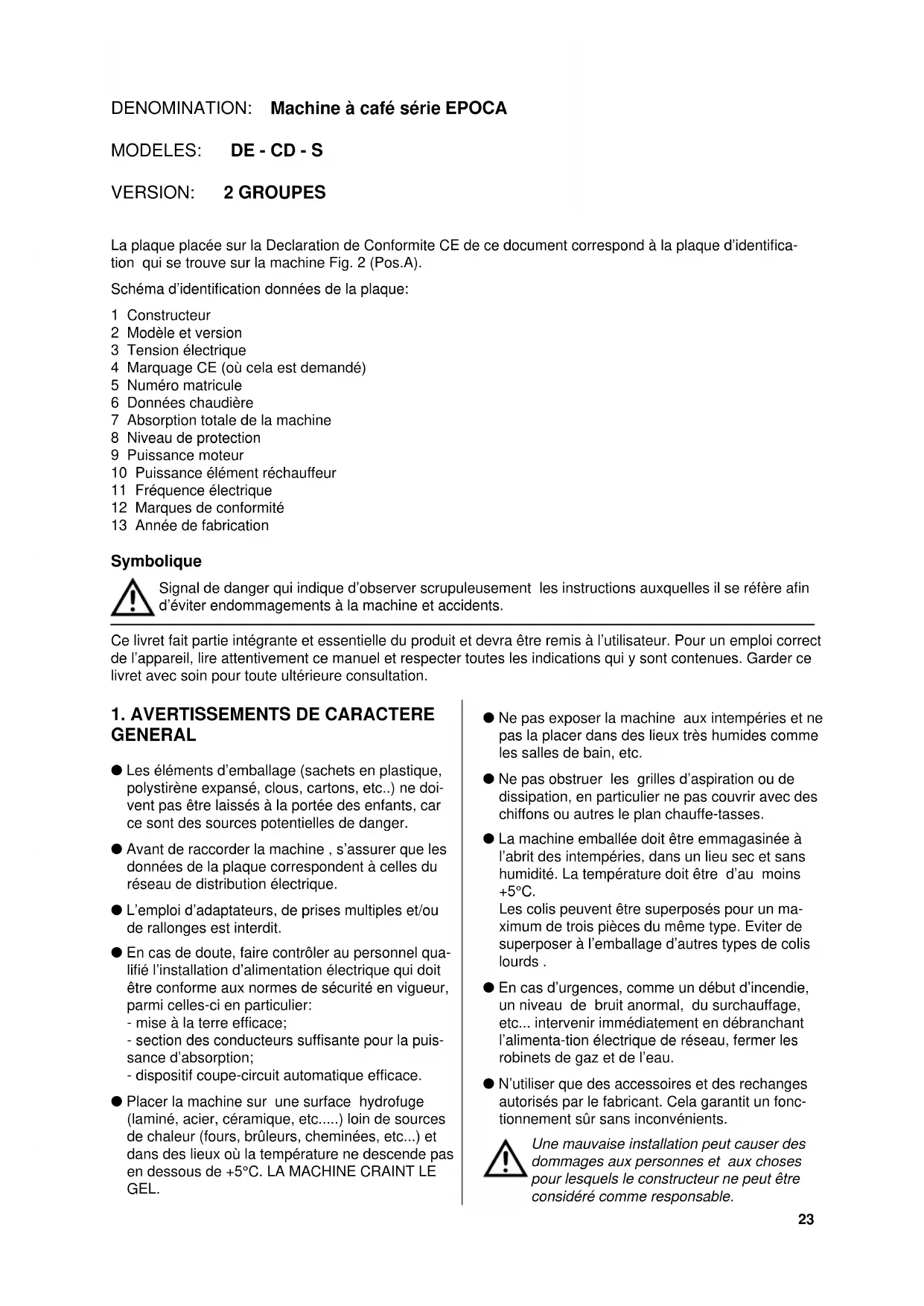 VERSION: 2 GROUPES La plaque placée sur la Declaration de Conformite CE de ce document correspond à la plaque d’identifica- tion qui se trouve sur la machine Fig. 2 (Pos.A). Schéma d’identification données de la plaque: 1 Constructeur 2 Modèle et version 3 Tension électrique 4 Marquage CE (où cela est demandé) 5 Numéro matricule 6 Données chaudière 7 Absorption totale de la machine 8 Niveau de protection 9 Puissance moteur 10 Puissance élément réchauffeur 11 Fréquence électrique 12 Marques de conformité 13 Année de fabrication Symbolique Signal de danger qui indique d’observer scrupuleusement les instructions auxquelles il se réfère afin d’éviter endommagements à la machine et accidents. Ce livret fait partie intégrante et essentielle du produit et devra être remis à l’utilisateur. Pour un emploi correct de l’appareil, lire attentivement ce manuel et respecter toutes les indications qui y sont contenues. Garder ce livret avec soin pour toute ultérieure consultation.
