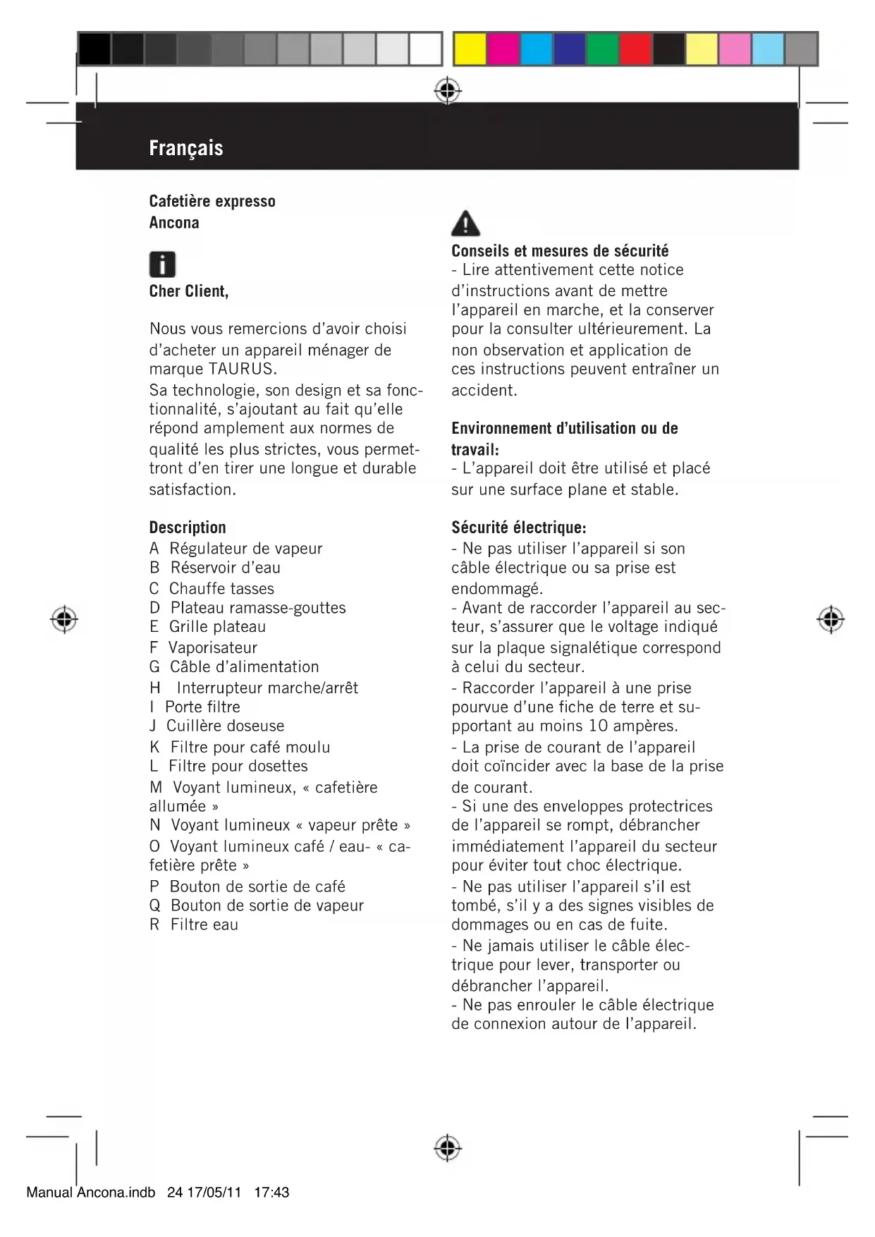 Retrouvez gratuitement la notice de l'appareil Ancona TAURUS au format PDF.