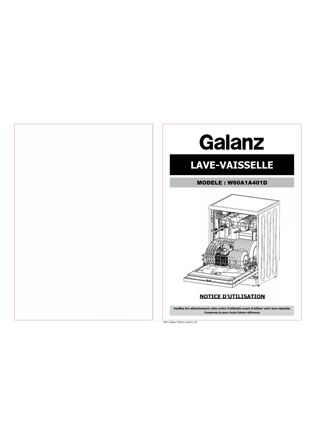 Veuillez lire attentivement cette notice d’utilisatin avant d’utiliser votre lave-vaisselle. Conservez-la pour toute future référence. LAVE-VAISSELLE MODELE : W60A1A401D7647 Galanz W60A1A401D_IB