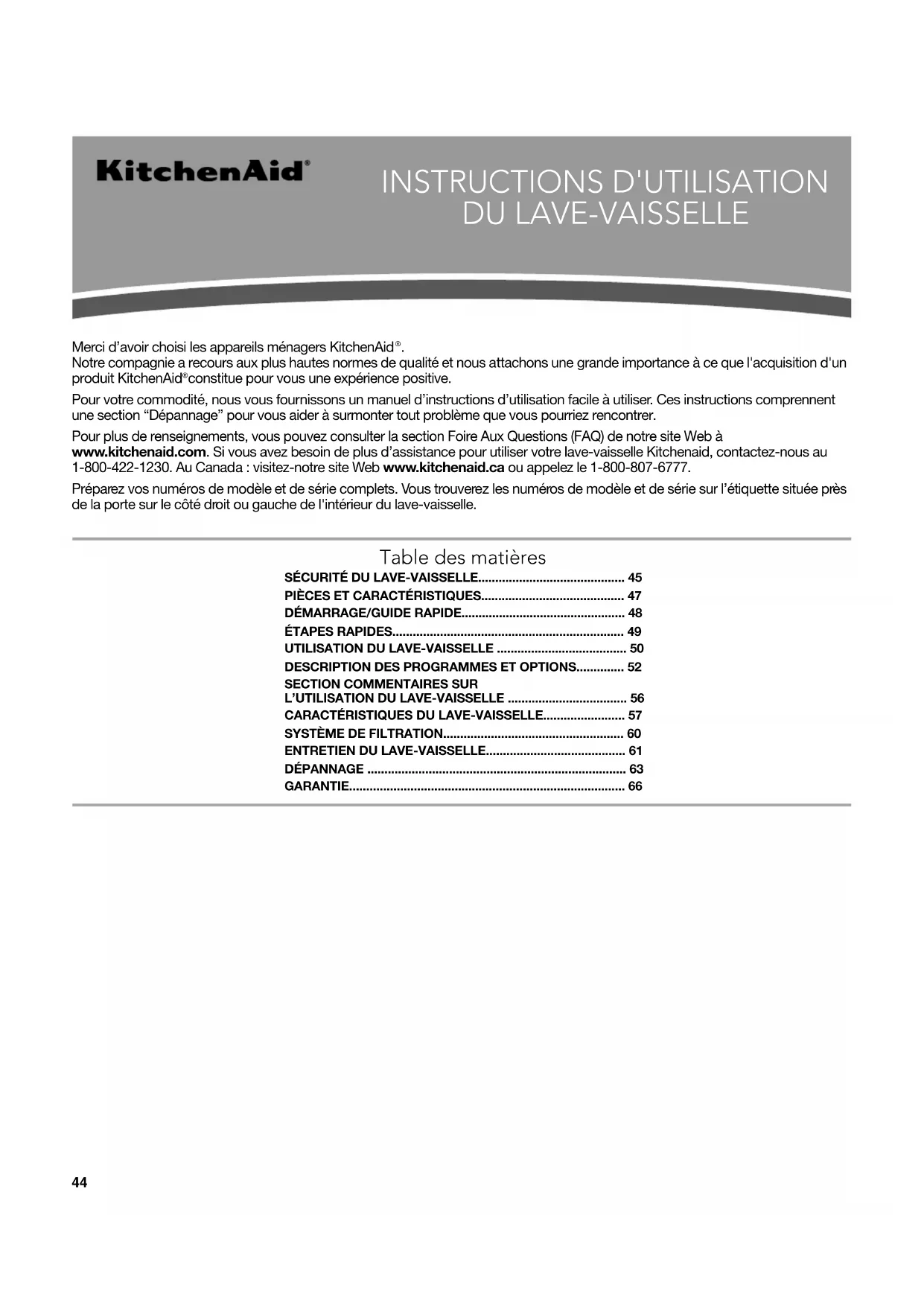 www.kitchenaid.com. Si vous avez besoin de plus d’assistance pour utiliser votre lave-vaisselle Kitchenaid, contactez-nous au