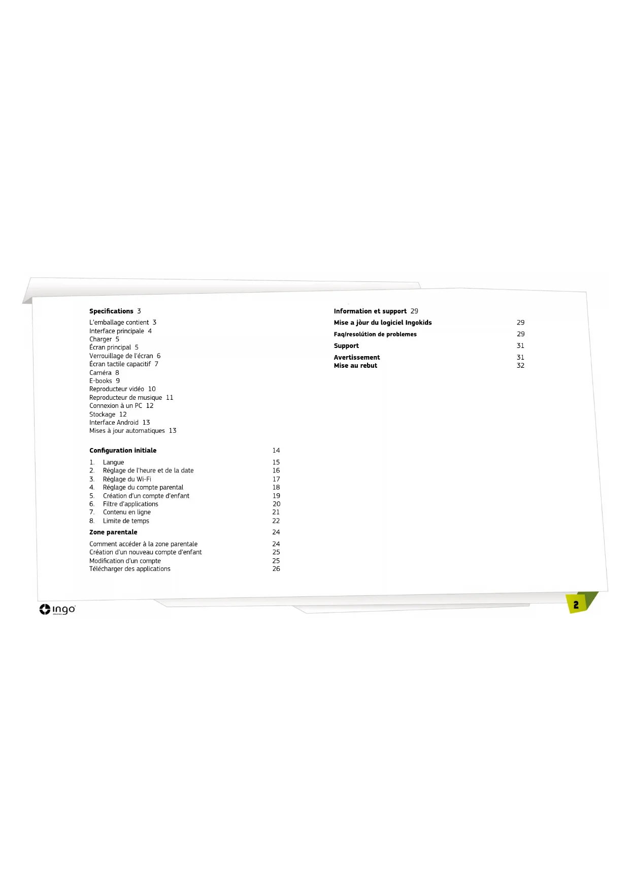 - Il vous sera demandé de saisir un numéro de carte de crédit. Vous pouvez choisir « Pas maintenant » pour l’éviter. Pour télécharger des applications depuis Google Play, vous devez naviguer dans la section des applications ou chercher en utilisant le bouton de recherche. Marché Ingo Le marché Ingo présentera de multiples applications adaptées à votre tablette Ingo. Visitez-le régulièrement pour trouver de nouvelles applications et jeux disponibles pour vous.28 Désinstallation d’applications Pour désinstaller des applications existantes, vous devez aller à Interface Android → Réglages→ Applications et choisir celle que vous voulez supprimer.29 Information et support Mise a jour du logiciel IngoKids Votre tablette vérie régulièrement les mises à jour. Lorsque le Wi-Fi est activé, le système eectuera des contrôles réguliers des mises à jour des logiciels. Si une mise à jour est disponible, nous vous recommandons de l’accepter, car elle contient d’importantes améliorations à votre système qui permettront d’en augmenter la performance et la fonctionnalité. FAQ / Résolution de problemès J’ai perdu le mot de passe du compte parental, que puis-je faire ? Lorsque la tablette vous invite à saisir le mot de passe parental, appuyez sur le bouton « Oubli du Mot de passe » et vous serez invité à saisir une adresse e-mail. Un e-mail avec les instructions sur la façon de réinitialiser le mot de passe sera envoyé à cette adresse. J’ai activé le dessin de verrouillage d’écran ou PIN et je ne m’en souviens plus, que dois-je faire ? La sécurité du verrouillage d’écran permet de protéger les données de votre tablette en cas de vol ou de perte. Dans ce cas, le dessin ou le mot de passe verrouillent le dispositif. Pour utiliser la tablette à nouveau contactez notre service clientèle. Quelle est la capacité maximale de la mémoire externe ? La tablette supporte jusqu’à 32 Go de cartes de mémoire microSD. Où puis-je trouver un boîtier en silicone ou caoutchouc pour protéger la tablette ? Visitez notre site Web www.ingodevices.com pour découvrir quand les produits accessoires de nos tablettes sont disponibles. Peut-on connecter une clé 3 G USB à la tablette ? Le port USB admet la connexion d’une clé USB 3 G pour se connecter à l’Internet à l’aide d’un plan de données portable. Vous aurez besoin d’un microUSB à l’adaptateur USB pour brancher des périphériques USB à votre tablette.30 Branchez la clé 3G à la tablette, en quelques secondes, il vous sera demandé de saisir le code PIN de la carte SIM de votre modem (Votre opérateur de téléphonie portable vous l’aura donné avec la carte SIM). Une fois le code PIN saisi, vous pouvez naviguer sur l’Internet en utilisant votre plan de données. Le son de la tablette est bas, est-ce normal ? Le volume de la tablette est limité pour protéger les oreilles de vos enfants. An de garantir le volume maximum, vous devez vous assurer qu’il est placé à son niveau maximum en appuyant sur la touche +. Nous vous recommandons aussi que le haut-parleur soit découvert car, si vous laissez la tablette dans un tiroir, le haut-parleur sera couvert et le volume sonnera bas. La tablette ne s’allume pas. Vériez le niveau de charge de la tablette, chargez-la à l’aide de l’adaptateur pendant 2 heures puis réessayez. Aucun son n’est émis de l’écouteur Vériez si le volume est réglé sur « 0 ». Vériez si l’écouteur fonctionne correctement en l’essayant avec un autre dispositif. Il y a un bruit sourd des écouteurs ou haut-parleur. Vériez s’il y a de la poussière dans l’écouteur ou le haut-parleur. La tablette reste verrouillée et ne répond à aucune touche ou bouton. Réinitialisez votre tablette en maintenant la touche d’alimentation enfoncée pendant quelques secondes. Une application ne fonctionne pas correctement Toutes les applications Android ne sont pas compatibles avec tous les dispositifs Android. Si vous avez téléchargé l’application, essayez de la télécharger à nouveau et réinstallez-la. Comment puis-je supprimer un compte Google ? Si un compte est ajouté, le compte est aché dans Interface Android → Réglages → Comptes & sync, où vous pouvez également ajouter un autre compte. Pour supprimer un compte non souhaité, sélectionnez le compte. Les informations de synchronisation du compte se chargent. Vous pouvez accéder aux réglages du compte sur l’angle supérieur droit (Trois points alignés s’achent). Dans le menu des réglages, sélectionnez « Supprimer un compte ».31 Autres Questions Si vous avez d’autres questions au sujet du réglage ou de l’utilisation de notre tablette, veuillez visiter www.ingodevices.com pour en savoir plus sur votre tablette, lisez les FAQ, téléchargez les guides de produits et regardez nos tutoriels vidéo en ligne. Support Avertissement