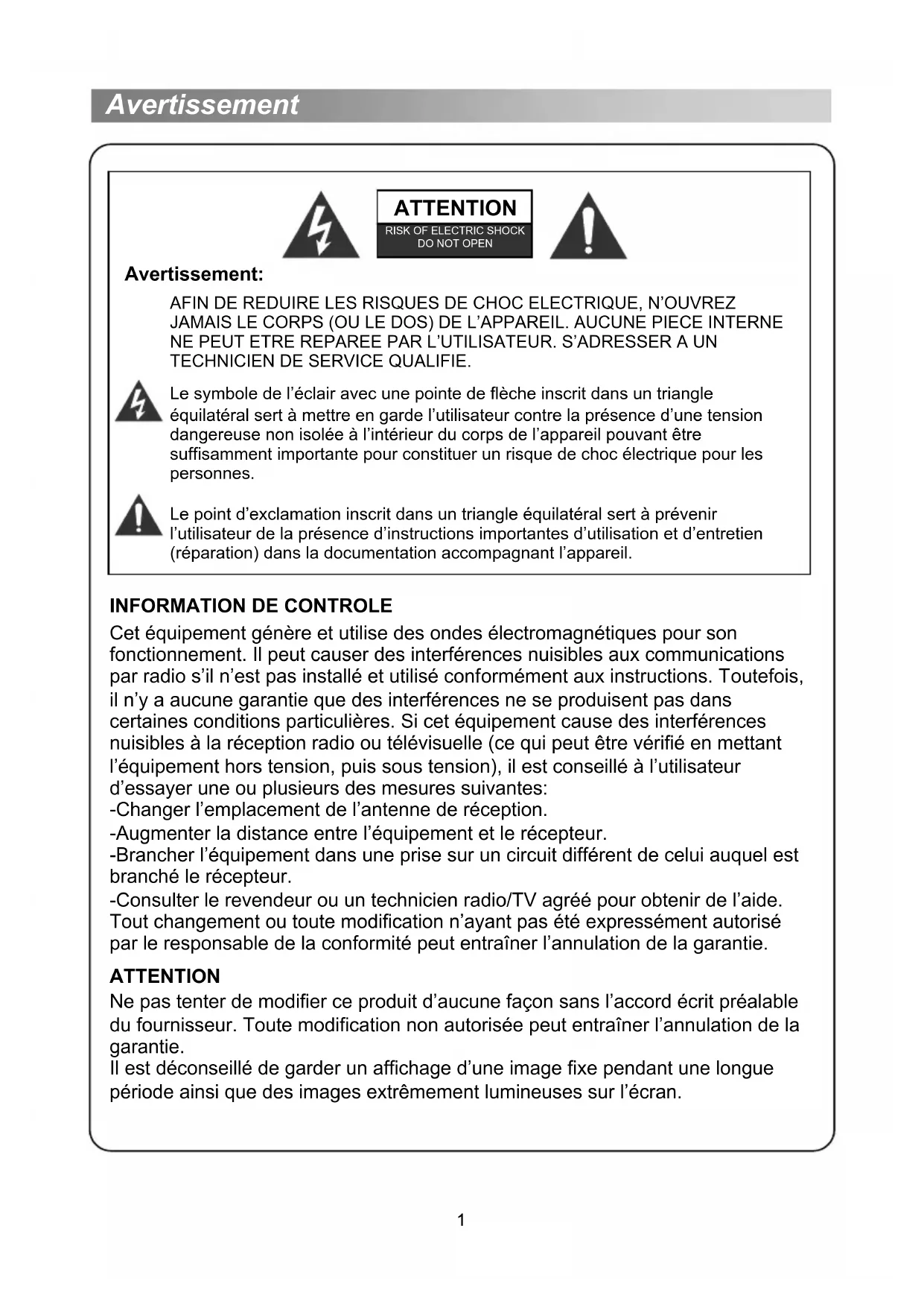 Cet équipement génère et utilise des ondes électromagnétiques pour son fonctionnement. Il peut causer des interférences nuisibles aux communications par radio s’il n’est pas installé et utilisé conformément aux instructions. Toutefois, il n’y a aucune garantie que des interférences ne se produisent pas dans certaines conditions particulières. Si cet équipement cause des interférences nuisibles à la réception radio ou télévisuelle (ce qui peut être vérifié en mettant l’équipement hors tension, puis sous tension), il est conseillé à l’utilisateur d’essayer une ou plusieurs des mesures suivantes: -Changer l’emplacement de l’antenne de réception. -Augmenter la distance entre l’équipement et le récepteur. -Brancher l’équipement dans une prise sur un circuit différent de celui auquel est branché le récepteur. -Consulter le revendeur ou un technicien radio/TV agréé pour obtenir de l’aide. Tout changement ou toute modification n’ayant pas été expressément autorisé par le responsable de la conformité peut entraîner l’annulation de la garantie. ATTENTION Ne pas tenter de modifier ce produit d’aucune façon sans l’accord écrit préalable du fournisseur. Toute modification non autorisée peut entraîner l’annulation de la garantie. Il est déconseillé de garder un affichage d’une image fixe pendant une longue période ainsi que des images extrêmement lumineuses sur l’écran.