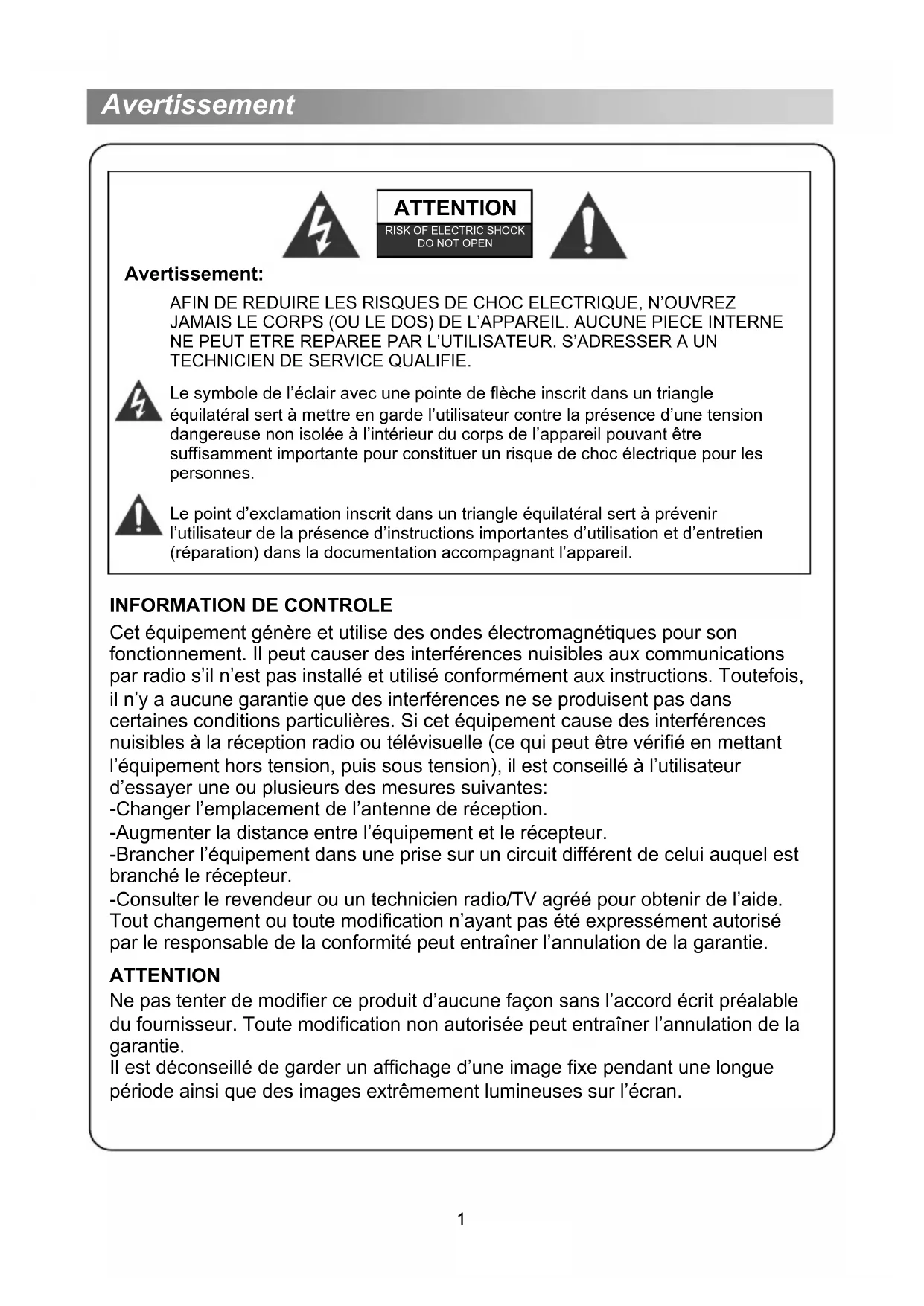 Cet équipement génère et utilise des ondes électromagnétiques pour son fonctionnement. Il peut causer des interférences nuisibles aux communications par radio s’il n’est pas installé et utilisé conformément aux instructions. Toutefois, il n’y a aucune garantie que des interférences ne se produisent pas dans certaines conditions particulières. Si cet équipement cause des interférences nuisibles à la réception radio ou télévisuelle (ce qui peut être vérifié en mettant l’équipement hors tension, puis sous tension), il est conseillé à l’utilisateur d’essayer une ou plusieurs des mesures suivantes: -Changer l’emplacement de l’antenne de réception. -Augmenter la distance entre l’équipement et le récepteur. -Brancher l’équipement dans une prise sur un circuit différent de celui auquel est branché le récepteur. -Consulter le revendeur ou un technicien radio/TV agréé pour obtenir de l’aide. Tout changement ou toute modification n’ayant pas été expressément autorisé par le responsable de la conformité peut entraîner l’annulation de la garantie. ATTENTION Ne pas tenter de modifier ce produit d’aucune façon sans l’accord écrit préalable du fournisseur. Toute modification non autorisée peut entraîner l’annulation de la garantie. Il est déconseillé de garder un affichage d’une image fixe pendant une longue période ainsi que des images extrêmement lumineuses sur l’écran.