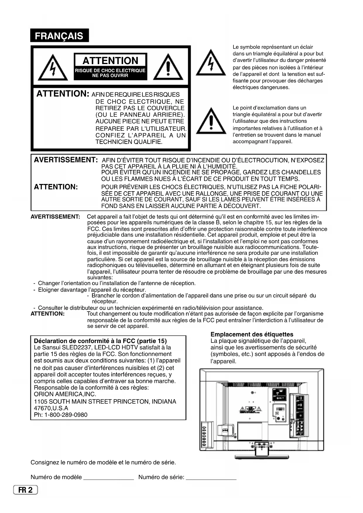 PAS CET APPAREIL À LA PLUIE NI À L’HUMIDITÉ.POUR ÉVITER QU’UN INCENDIE NE SE PROPAGE, GARDEZ LES CHANDELLES OU LES FLAMMES NUES À L’ÉCART DE CE PRODUIT EN TOUT TEMPS. ATTENTION: POUR PRÉVENIR LES CHOCS ÉLECTRIQUES, N’UTILISEZ PAS LA FICHE POLARI-SÉE DE CET APPAREIL AVEC UNE RALLONGE, UNE PRISE DE COURANT OU UNE AUTRE SORTIE DE COURANT, SAUF SI LES LAMES PEUVENT ÉTRE INSÉRÉES À FOND SANS EN LAISSER AUCUNE PARTIE À DÉCOUVERT.Consignez le numéro de modèle et le numéro de série.Numéro de modèle _______________ Numéro de série: _______________Déclaration de conformité à la FCC (partie 15)Le Sansui SLED2237, LED-LCD HDTV satisfait à la partie 15 des règles de la FCC. Son fonctionnement est soumis aux deux conditions suivantes: (1) l’appareil ne doit pas causer d’interférences nuisibles et (2) cet appareil doit accepter toutes interférences reçues, y compris celles capables d’entraver sa bonne marche. Responsable de la conformité à ces règles:ORION AMERICA,INC.1105 SOUTH MAIN STREET PRINCETON, INDIANA 47670,U.S.APh: 1-800-289-0980 J3KY0821A_EnFr.indb 2J3KY0821A_EnFr.indb 2 6/7/12 9:19:52 AM6/7/12 9:19:52 AM3 FR