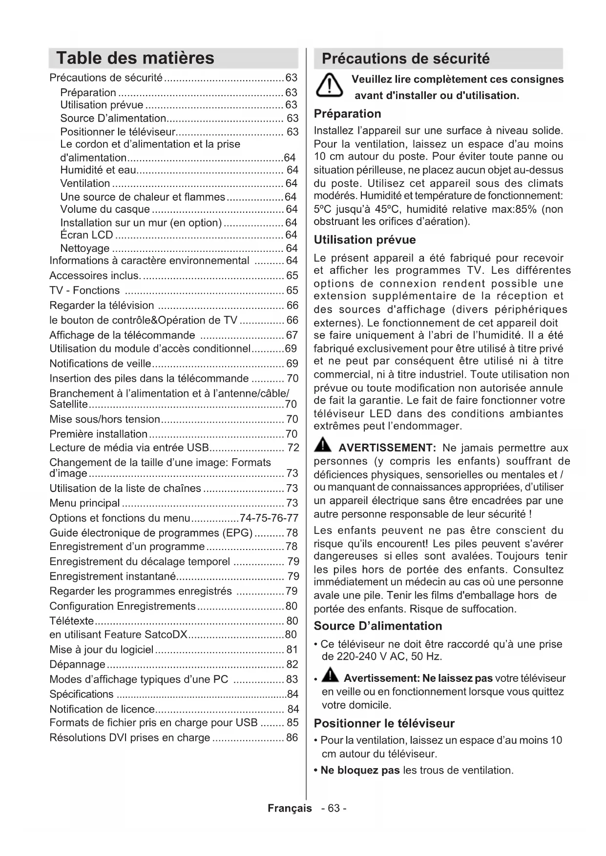 - Ne bloquez pas les trous de ventilation. Table des matières Précautions de sécurité ........................................ 63 Préparation ....................................................... 63 Utilisation prévue .............................................. 63 Source D’alimentation....................................... 63 Positionner le téléviseur.................................... 63 Le cordon et d’alimentation et la prise d'alimentation .................................................... 64 Humidité et eau................................................. 64 Ventilation ......................................................... 64 Une source de chaleur et ammes ................... 64 Volume du casque ............................................ 64 Installation sur un mur (en option) .................... 64 Écran LCD ........................................................ 64 Nettoyage ......................................................... 64 Informations à caractère environnemental .......... 64 Accessoires inclus. ............................................... 65 TV - Fonctions ..................................................... 65 Regarder la télévision .......................................... 66 le bouton de contrôle&Opération de TV ............... 66 Afchage de la télécommande ............................ 67 Utilisation du module d’accès conditionnel ........... 69 Notications de veille ............................................ 69 Insertion des piles dans la télécommande ........... 70 Branchement à l’alimentation et à l’antenne/câble/ Satellite ................................................................. 70 Mise sous/hors tension ......................................... 70 Première installation ............................................. 70 Lecture de média via entrée USB......................... 72 Changement de la taille d’une image: Formats d’image ................................................................. 73 Utilisation de la liste de chaînes ........................... 73 Menu principal ...................................................... 73 Options et fonctions du menu ................ 74-75-76-77 Guide électronique de programmes (EPG) .......... 78 Enregistrement d’un programme .......................... 78 Enregistrement du décalage temporel ................. 79 Enregistrement instantané.................................... 79 Regarder les programmes enregistrés ................ 79 Conguration Enregistrements ............................. 80 Télétexte ............................................................... 80 en utilisant Feature SatcoDX ................................ 80 Mise à jour du logiciel ........................................... 81 Dépannage ........................................................... 82 Modes d’afchage typiques d’une PC ................. 83 Spécications .............................................................84 Notication de licence........................................... 84 Formats de chier pris en charge pour USB ........ 85 Résolutions DVI prises en charge ........................ 86Français - 64 -