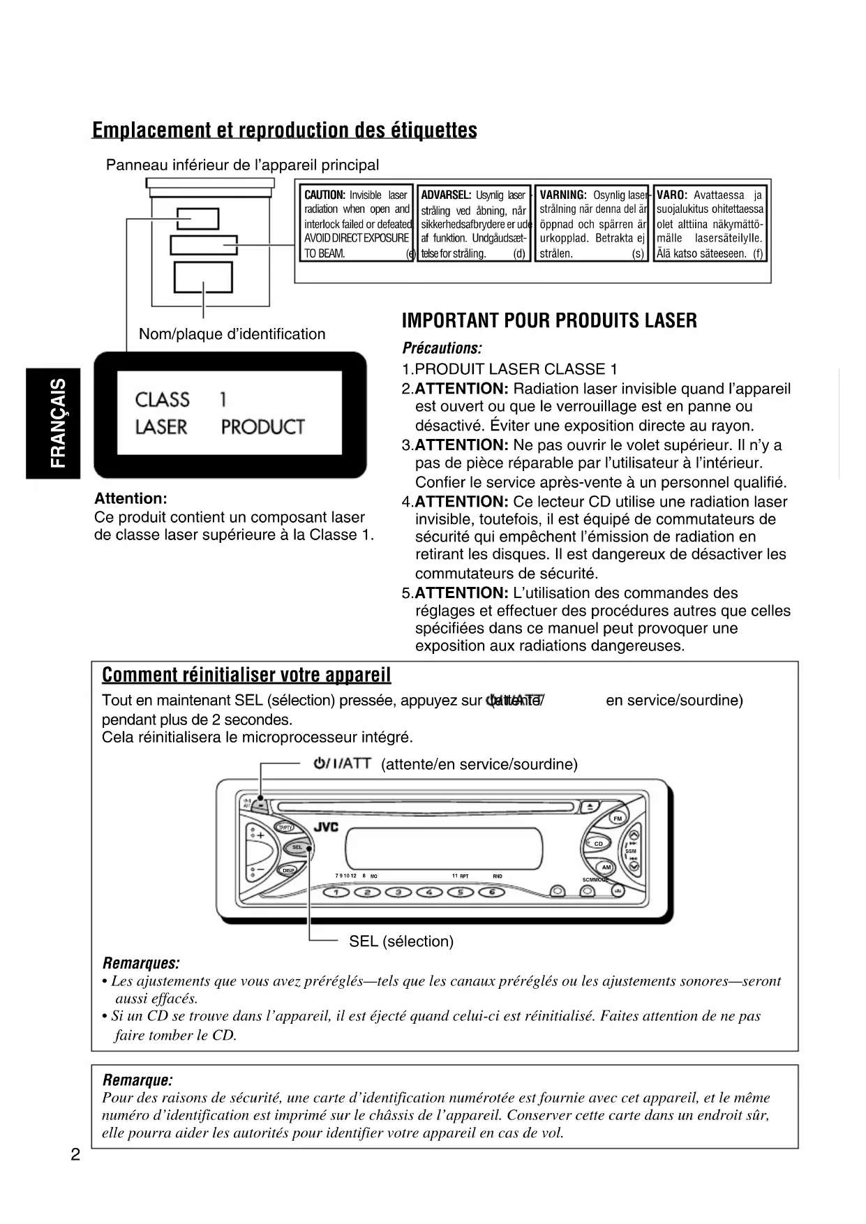 FRANÇAIS Remarque: Pour des raisons de sécurité, une carte d’identification numérotée est fournie avec cet appareil, et le mêmenuméro d’identification est imprimé sur le châssis de l’appareil. Conserver cette carte dans un endroit sûr,elle pourra aider les autorités pour identifier votre appareil en cas de vol. Emplacement et reproduction des étiquettes