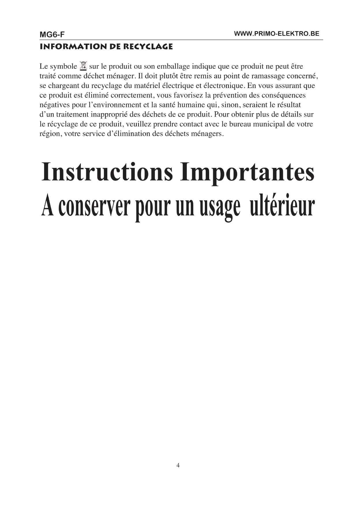 Le symbole sur le produit ou son emballage indique que ce produit ne peut être traité comme déchet ménager. Il doit plutôt être remis au point de ramassage concerné, se chargeant du recyclage du matériel électrique et électronique. En vous assurant que ce produit est éliminé correctement, vous favorisez la prévention des conséquences négatives pour l’environnement et la santé humaine qui, sinon, seraient le résultat d’un traitement inapproprié des déchets de ce produit. Pour obtenir plus de détails sur le récyclage de ce produit, veuillez prendre contact avec le bureau municipal de votre région, votre service d’élimination des déchets ménagers. Instructions Importantes A conserver pour un usage ultérieurMG6-F